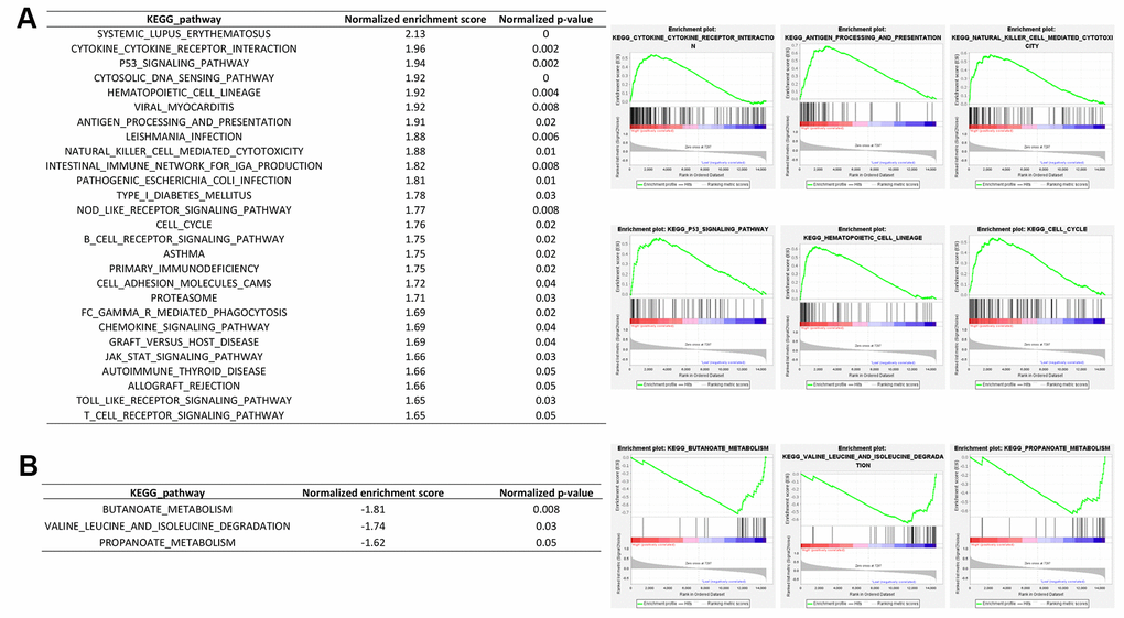 We next performed the differential gene expression (DGE) analysis between RIPK2 high-expression sub-group (N = 132) and RIPK2 low-expression sub-group (N = 132) based on the KIRC cohort of the TCGA database (Figure 2). In total, we identified 471 significantly up-regulated genes and 263 down-regulated genes in RIPK2 high expression samples when compared with low expression samples (Supplementary Table 1). And more interestingly, when we performed the gene ontology (GO) enrichment analysis by using these up-regulated genes as input, the results showed that nearly all of the enriched functional terms (9 of the top 10 enriched gene ontology terms) were immune-related (Figure 2B). Then, the gene set enrichment analysis (GSEA) by using the KEGG pathway gene sets from MSigDB database was also been employed (Figure 3A), which revealed that most of the immunologically related pathways (Cytokine-cytokine receptor interaction pathway, Antigen processing and presentation pathway, Natural killer cell mediated cytotoxicity, B cell receptor signaling pathway, T cell receptor signaling pathway) were positively enriched in samples harboring RIPK2 high-expression compared with RIPK2-low expression samples (Figure 3A, Supplementary Figure 1). We also found a very limited number of significantly enriched metabolism-related gene sets (Butanoate metabolism pathway, Valine, leucine, and isoleucine degradation pathway, Propanoate metabolism pathway) were negatively enriched in RIPK2 high-expression KIRC patients (Figure 3B). Consistently, most significantly KEGG pathway gene sets (the two of three) that enriched in sub-groups with RIPK2 high-expression of KIRC patients were immune signaling related pathways (Figure 3B).