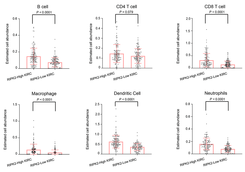 RIPK2 has been associated with activation of the NF-κB, JNK, extracellular signal-regulated kinase (ERK), and mitogen-activated protein kinase (p-38) pathways. RIPK2 also mediates pro-inflammatory signaling from the bacterial sensors NOD1 and NOD2 and is an emerging therapeutic target in autoimmune and inflammatory diseases [19, 21, 22]. Interestingly, a strong correlation between RIPK2 over-expression and dysregulated tumor immune infiltration level was found in this work. RIPK2 promoted various immunological signaling pathways and immune phenotypes (including CD8 T cell, Dendritic cell, B cells, Neutrophils, and Macrophages) in the tumor microenvironment. The tumor microenvironment with chemotactic characteristics would recruit infiltrating immune cells including lymphocytes (such as T cell, B cell, and NK cell) and myeloid cell (such as monocyte, macrophage, and neutrophil). Usually, these infiltrating immune cells serve as a protective antitumoral role in the tumor microenvironment, but they could also contribute to cancer progression under particular circumstances. As exemplified by the tumor-associated macrophages (TAM), they could release angiogenic factors and fibroblast growth factors, which result in tumorigenesis and promote the process of tumor growth, invasion, and apoptotic resistance [7, 13, 23]. Thus, high infiltration of immune cells in kidney tumor samples may support tumors as that tumor cells, in turn, modulate the microenvironment within which they reside. Given that our work showed the potential linking between RIPK2 dysregulated expression and altered immunological activities in the tumor microenvironment of KIRC, we believe that the increase of RIPK2 transcripts would cause NF-κB signaling activation and subsequently contributing to KIRC pathogenesis and aggressiveness. The mechanism is still unclear what causes these links but the results presented lead us to suggest the possible use of RIPK2 as a therapeutic marker, which will shed light on the future development of anti-cancer therapies for KIRC.