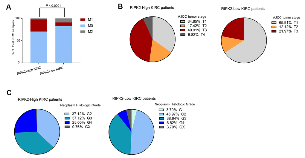 We next analyzed the distribution of clinical and pathological features among different RIPK2 expression sub-groups. As expected, the tumor samples with metastasis status: M1 (spread to other parts of the body patients) were dramatically enriched in the sub-groups of KIRC patients harboring high-expression of the RIPK2 gene (P < 0.0001, Figure 7A). Moreover, we also observed that there were dramatic differences in tumor stage (Figure 7B) and histologic grade (Figure 7C) distribution between high- and low-expression of RIPK2 sub-groups. The tumors with RIPK2 over-expression showed an increased risk of the high-grade stage when compared with RIPK2 low-expression samples, and this was also confirmed at protein levels of both total protein and phosphorylation state (Supplementary Figure 3).
