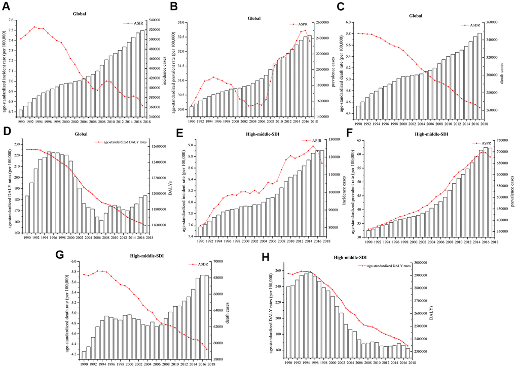 Similar to the trends of prevalent cases and ASPRs worldwide, high-middle-SDI countries and territories had consistently increasing numbers of prevalent cases and ASPRs, and the values in 2017 were almost double those in 1990. The EAPC in the ASPR in high-middle-SDI countries and territories was 2.52% (95% CI 2.37% to 2.66%, P<0.01). The number of incident cases and the ASIR in high-middle-SDI countries and territories increased from 80,397 (95% UI 67,571 to 87,985) and 7.59 (95% UI 6.44 to 8.27) to 123,669 (95% UI 106,234 to 132,373) and 8.68 (95% UI 7.43 to 9.46), respectively. The number of deaths in high-middle-SDI countries and territories increased slightly over the past 28 years, in contrast, the ASDR decreased slightly, with an EAPC of -1.21% (95% CI -1.29% to -1.12%, P<0.01). Both the DALY and age-standardized DALY rates in the high-middle-SDI countries decreased sharply from 1990 to 2017 and with an the EAPC of -1.72% (95% CI -1.85% to -1.59%, P<0.01) (Table 1 and Figure 1E–1H).