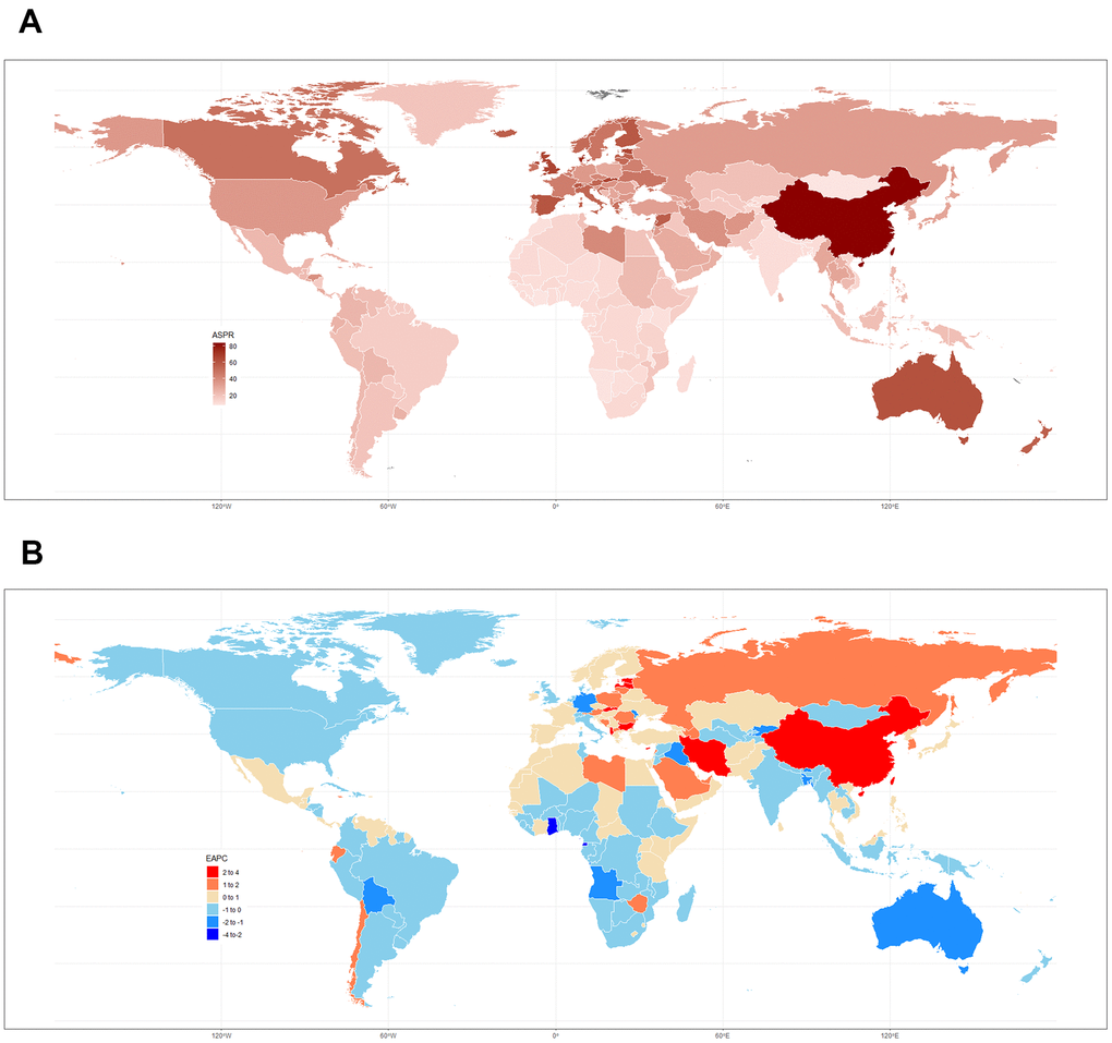 The ASPR of leukemia in 2017 varied from 7.98 to 83.51 cases per 100,000 population. China (83.51 (95% UI 67.27 to 95.01)), Denmark (74.53 (95% UI 63.06 to 86.57)), and Slovakia (66.52 (95% UI 50.70 to 81.89)) had the highest ASPRs in 2017. Mongolia (7.98 (95%UI 6.22 to 10.30)), Malawi (8.08 (95%UI 5.79 to 10.08)), and Cote d’Ivoire (8.41 (95%UI 6.48 to 10.30)) had the lowest rates. Slovakia (3.60% (95% CI 3.39% to 3.81%, P<0.01)), Taiwan (Province of China) (3.00% (95% CI 2.75% to 3.25%, P<0.01)), and China (2.97% (95% CI 2.66% to 3.28%, P<0.01)) had the greatest increase from 1990 to 2017. Ghana (-2.14% (95% CI -1.69% to -2.59%, P<0.01)), Equatorial Guinea (-2.09% (95% CI -1.80% to -2.38%, P<0.01)), and Kyrgyzstan (-1.99% (95% CI -1.83% to -2.15%, P<0.01)) had the greatest decreases. The ASPRs in 2017 and the related EAPCs among 195 countries and territories are presented in Figure 2.