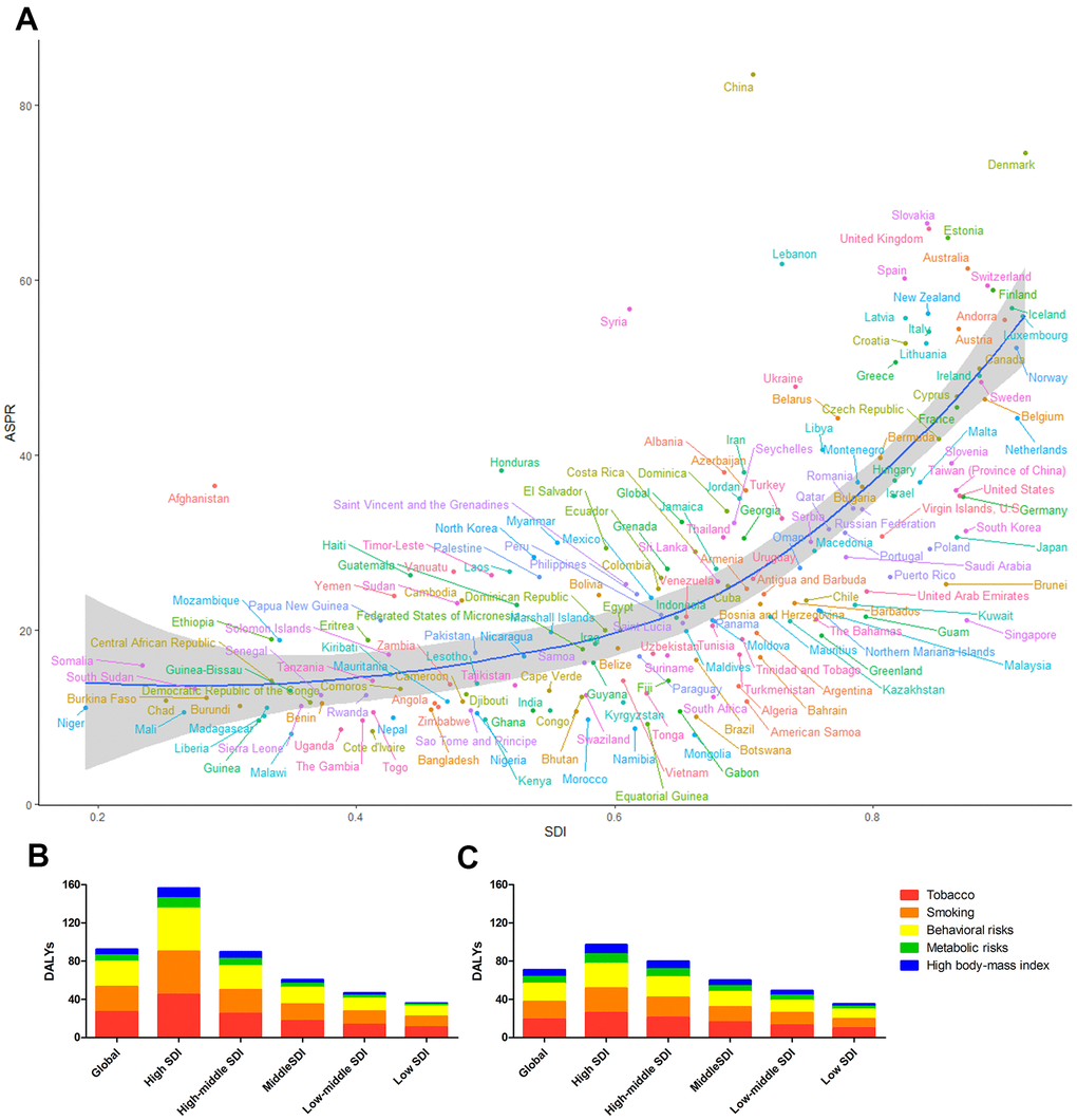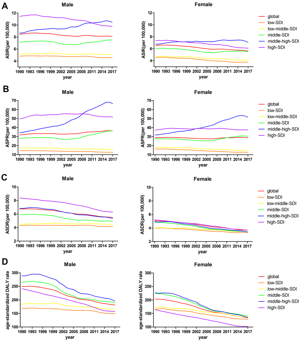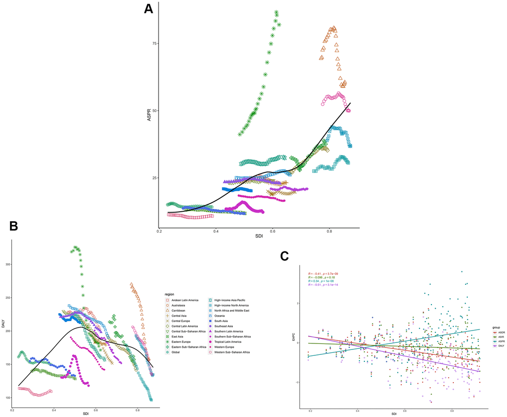 We also analyzed the EAPCs of 195 countries and territories by SDI in 2017. We observed a statistically significant correlation between the EAPC in the ASPR and the SDI (R=0.34, P<0.01). In addition, a negative correlation between the change in the ASDR and SDI (R=-0.41, P<0.01), was found; this correlation was also observed for the DALYs trend (R=-0.51, P<0.01) in 2017. There was no correlation between the EAPC in the ASIR and SDI (Figure 5C).