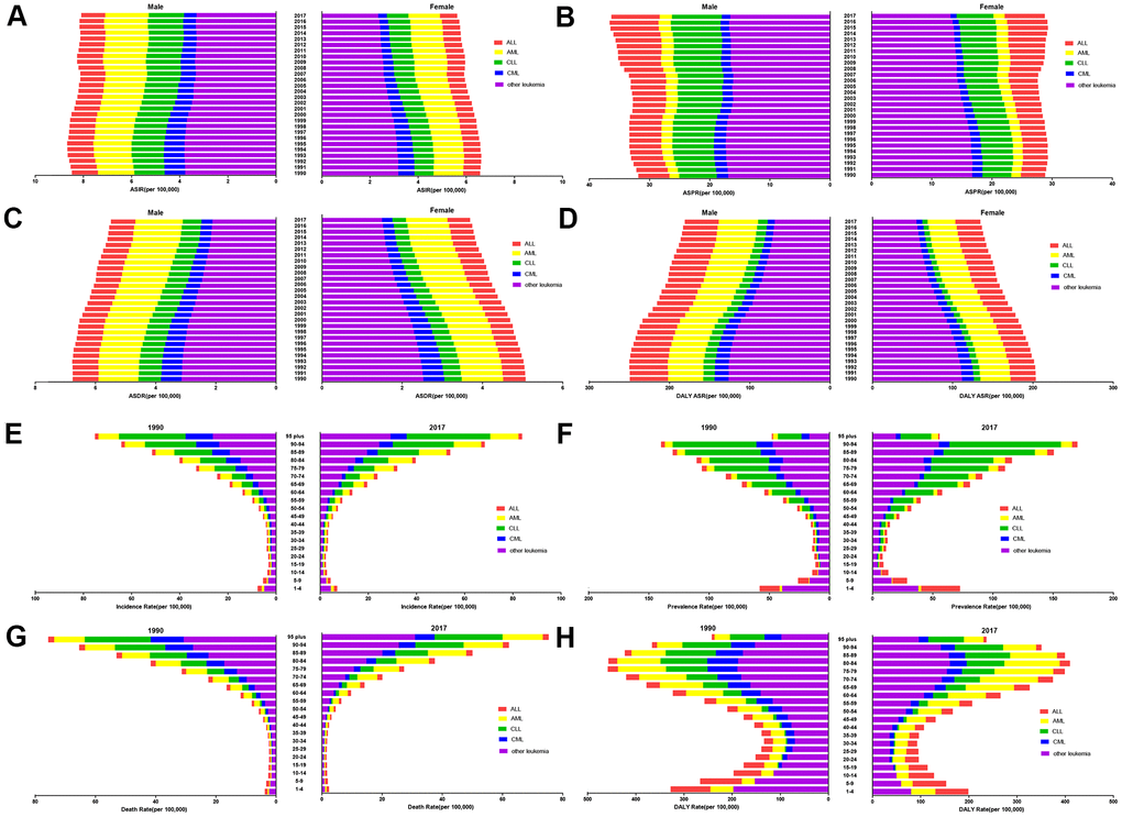 In the current study, the ASPRs of leukemia per 100,000 population were 36.33 (95% UI 32.14 to 39.18) in males and 28.75 (95% UI 24.65 to 31.83) in females in 2017. There was a moderate decline in the ASPR in females, whereas the rate was significantly increased in males during the same period. At the global level, the ASRs in high-SDI, and high-middle-SDI countries and territories were mostly higher in males than in females. In addition, there were no obvious differences in the ASRs between male and female in middle-SDI, low-middle-SDI, and low-SDI countries and territories (Figure 3). The ASPR trend increased yearly in middle-high-SDI countries and territories, peaking in 2016 in both males and females (Figure 3B). Among the ASRs observed in the past 28 years, only the ASPR in males had an increased EAPC (0.43% (95% CI 0.34% to 0.53%, P<0.01)) (Table 1). Statistics were calculated on the basis of the five types of leukemia in males and females. Among the leukemia types, acute myeloid leukemia (AML) was the leading contributor to the ASIR, ASDR, and the age-standardized DALY rate. Regarding the ASPR of leukemia in 2017, chronic lymphocytic leukemia (CLL) (8.28 (95% UI 7.66 to 8.95)) was the second leading contributor in males, whereas acute lymphocytic leukemia (ALL) (6.65 (95%UI 5.17 to 7.90)) was the second leading cause in female. chronic myeloid leukemia (CML) accounted for the smallest proportion of all ASRs (Figure 4A–4D).