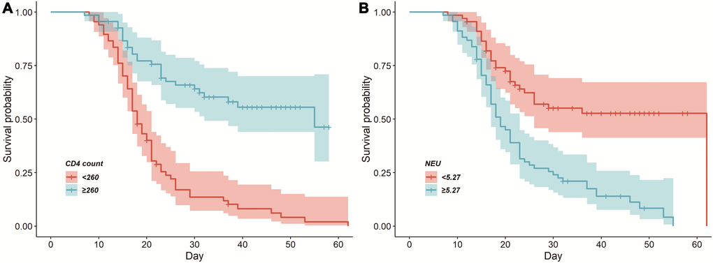Further survival analysis revealed that CD4 + T cell counts and neutrophil counts remained significant for the prediction of mortality risk in COVID-19 patients. We took the median of the laboratory parameters of all patients for group analysis and plotted a Kaplan-Meier (K-M) survival curve (Figure 1). As shown in Table 5, after adjustment for age and gender, neutrophils ≥5.27 × 109/L (HR = 2.010, 95%CI 1.256–3.217; p = 0.004) may increase the risk of death. However, CD4 + T cells ≥ 260/μL (HR = 0.420, 95%CI 0.256–0.689; p = 0.001) appeared to reduce the risk of death.