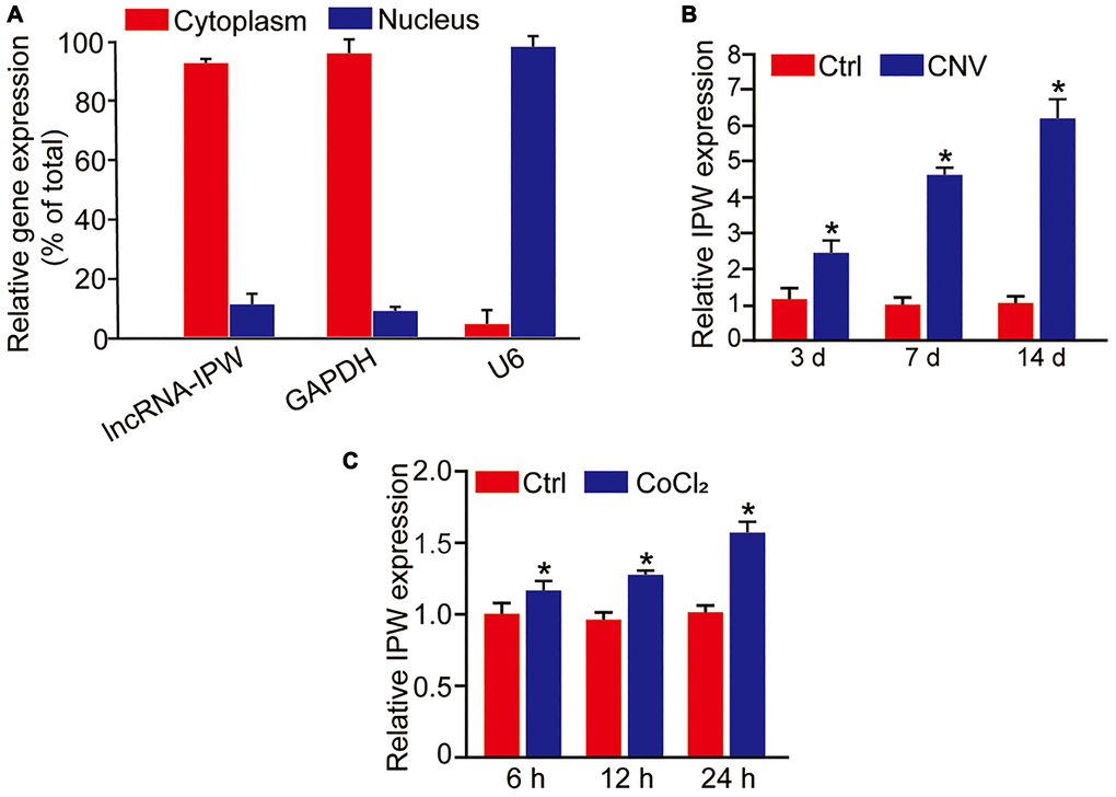 We first determined the expression pattern of IPW in chorioretinal endothelial cells (RF/6A). qRT-PCR assays revealed that IPW was mainly expressed in the cytoplasm of RF/6A cells (Figure 1A). We then determined whether IPW was dysregulated in the CNV model. qRT-PCR assays showed that IPW was significantly up-regulated in the RPE/choroid complex on day 3, day 7, and day 14 after laser photocoagulation (Figure 1B). Hypoxia is considered as a critical factor in the etiology of CNV [22]. RF/6A cells were exposed to CoCl2 for 6 h, 12 h, and 24 h to mimic hypoxia stress. qRT-PCR assay revealed that IPW was significantly up-regulated in hypoxic group in a time-dependent manner (Figure 1C).