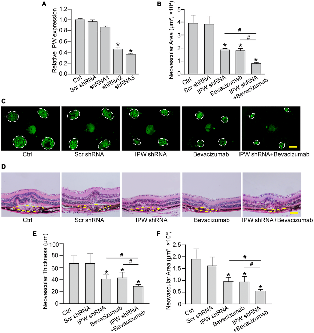 To determine the role of IPW in the formation of choroidal neovascularization, we designed 3 different short hairpin RNA (shRNAs) for IPW silencing. Two shRNAs could significantly reduce IPW expression. We selected IPW shRNA3 in the following study because it had the greatest silencing efficiency (Figure 3A). The area of CNV lesion was measured on day 14 after CNV formation. IPW silencing could reduce the formation of CNV by 54% compared with the CNV group, showing a similar effect as anti-VEGF drug (Figure 3B and 3C). The histology of CNV lesion at the same time point was further characterized. In the HE-stained paraffin section, the reduction of neovascular area and neovascular thickness was observed in the samples from IPW shRNA-injected group (Figure 3D). Moreover, intravitreal treatment of bevacizumab plus IPW shRNA showed a better outcome as shown by decreased neovascular thickness (Figure 3E) and neovascular area (Figure 3F). By contrast, IPW overexpression accelerated CNV formation compared with Ctrl group (Supplementary Figure 2). Collectively, these results indicate that IPW is involved in the formation of CNV in vivo.