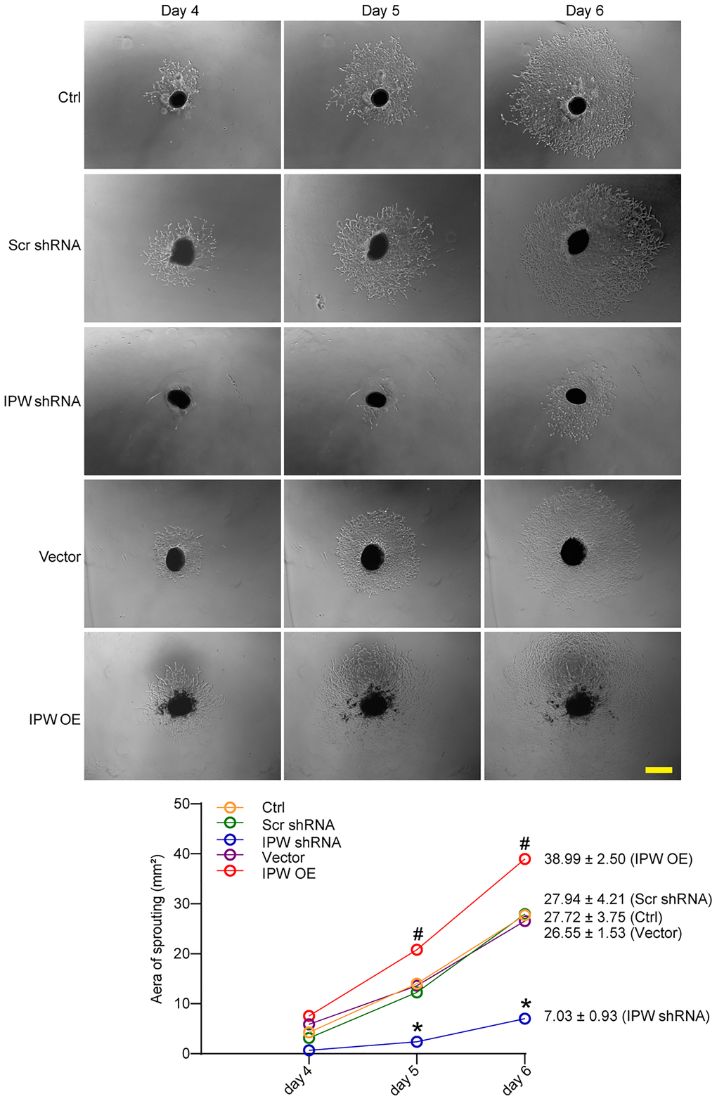 Next, we determined the role of IPW in choroid sprouting using the ex vivo CNV model. The choroid was dissected and embedded in Matrigel and cultured for 7 days. The area occupied by the migrated cells was quantified. The result showed that the sprouting area from the explant was significantly reduced after IPW silencing (Figure 4). By contrast, IPW overexpression led to increased sprouting ability compared with the vector group (Figure 4).