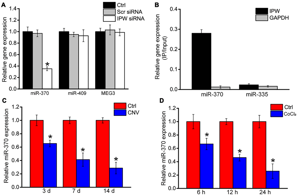 Gene imprinting plays a crucial role in early embryogenesis and later development [30]. IPW is identified as a long non-coding RNA in PWS locus. It is also shown as a critical regulator of DLK1-DIO3 region. IPW overexpression leads to the downregulation of maternally expressed genes (MEGs) in the imprinted DLK1-DIO3 locus, suggesting a role in gene imprinting regulation [21]. Reactivation of silent embryonic genes or aberrant imprinting may lead to the occurrence of human disease [31–33]. LncRNAs can regulate gene expression both in cis and in trans through the association with chromatin modifiers. By establishing genomic imprinting of target genes, lncRNAs are involved in several biological processes, including embryonic growth, pluripotency maintenance, cell differentiation, and neural-related functions. In this study, silencing of IPW lead sto reduced expression of miR-370. RNA pull-down assays confirmed the direct interaction between miR-370 and IPW. IPW silencing could lead to increased expression of miR-370. miR-370 shows an opposite expression pattern compared with IPW expression in laser-induced CNV lesions and endothelial cells following hypoxic stress.