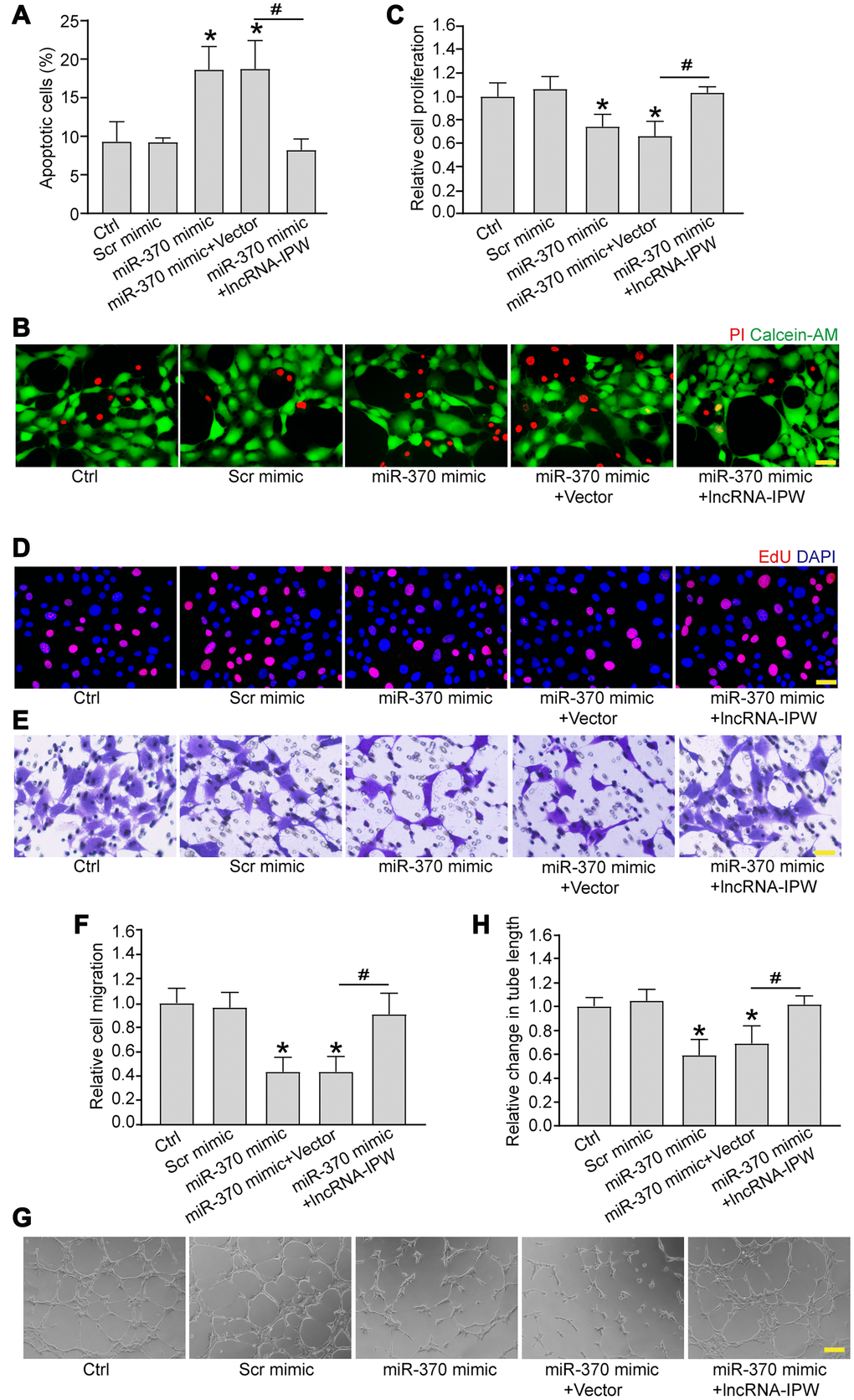 We next determined whether miR-370 was involved in the regulation of endothelial angiogenic function. Transfection of miR-370 mimic led to increased apoptosis in response to hypoxic stress (Figure 6A and 6B). Increased miR-370 led to reduced cell proliferation (Figure 6C and 6D), reduced cell migration (Figure 6E and 6F), and reduced tube formation activity compared to Ctrl group (Figure 6G and 6H). Moreover, IPW overexpression could rescue the inhibitory effects of miR-370 mimic on endothelial angiogenic function (Figure 6A–6H).