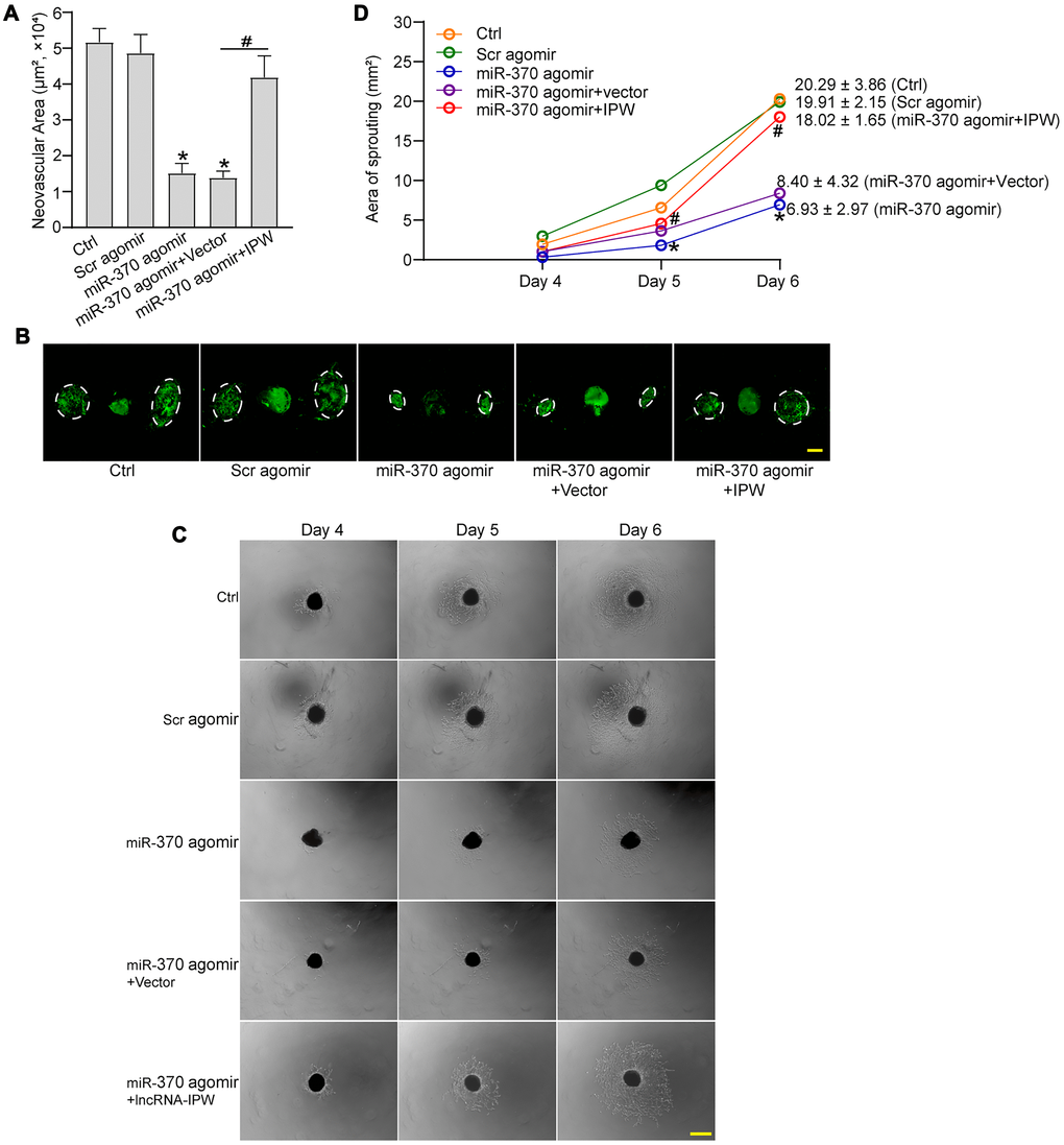 We next determined the role of miR-370 in CNV formation in vivo and ex vivo. In laser-induced CNV model, miR-370 agomir inhibited the formation of CNV compared with the CNV group. By contrast, IPW overexpression rescued the inhibitory effects of miR-370 agomir on CNV formation (Figure 7A and 7B). In the ex vivo choroidal sprouting assay, miR-370 agomir led to reduced sprouting capacity of choroidal explants compared with Ctrl group. By contrast, IPW overexpression abolished the inhibitory effects of miR-370 agomir on CNV formation and led to increased sprouting capacity of choroidal explants (Figure 7C and 7D). Collectively, the above-mentioned results indicate that IPW/miR-370 interaction is involved in the regulation of CNV formation in vivo and ex vivo.