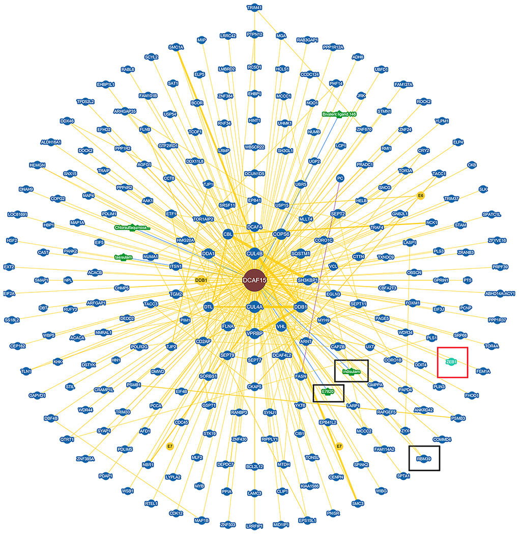 To identify the molecular partners interacting with ZEB1, we surveyed a large-scale protein-protein interaction database (https://thebiogrid.org/124705/summary/homo-sapiens/dcaf15.html) and noted that ZEB1 (red frame) is a potential interactor of DCAF15(Figure 1). We then co-expressed Flag-DCAF15 and Myc-ZEB1 in 293T cells, after which the cells were harvested for co-immunoprecipitation (Co-IP) assays. The results indicated that Myc-ZEB1 was immunoprecipitated by Flag-DCAF15 (Figure 2A). Similarly, reciprocal Co-IP assays performed after co-transfecting cells with Flag-ZEB1 and Myc-DCAF15 showed that Myc-DCAF15 was immunoprecipitated by Flag-ZEB1 (Figure 2B), indicating exogenous interaction between these two proteins. We also observed that endogenous DCAF15 was efficiently immunoprecipitated by ZEB1 (Figure 2C) and that endogenous ZEB1 was efficiently immunoprecipitated by DCAF15 (Figure 2D), suggesting there is also endogenous interaction between ZEB1 and DCAF15.