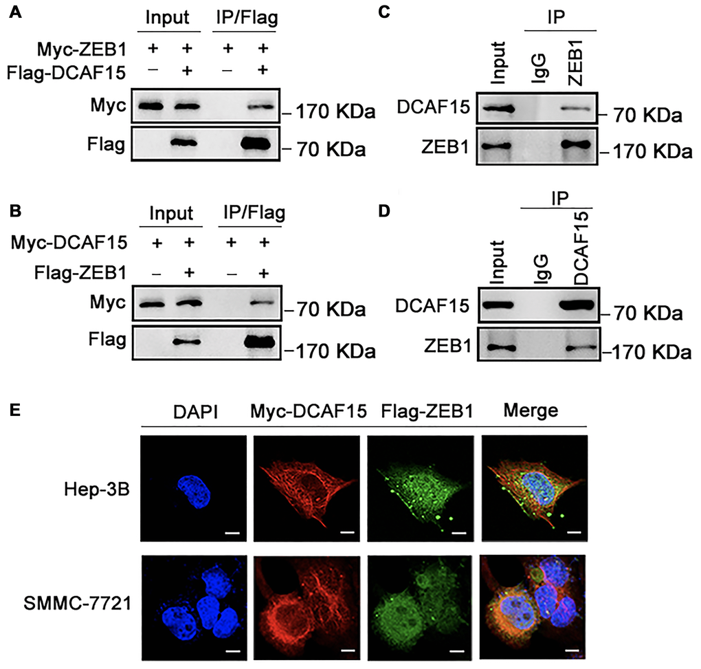 To further investigate the intracellular interaction between ZEB1 and DCAF15, we examined their subcellular localization in two HCC cell lines (Hep-3B and SMMC-7721). After transfecting the cells with Flag-ZEB1 and Myc-DCAF15, they were immunofluorescence-stained with anti-Flag or anti-Myc antibodies. Upon visualization under a microscope, we observed that the exogenous ZEB1 and DCAF15 colocalized in the cytoplasm (Figure 2E). Taken together, these results strongly suggest that DCAF15 forms a complex with ZEB1 within the cytoplasm of HCC cells.