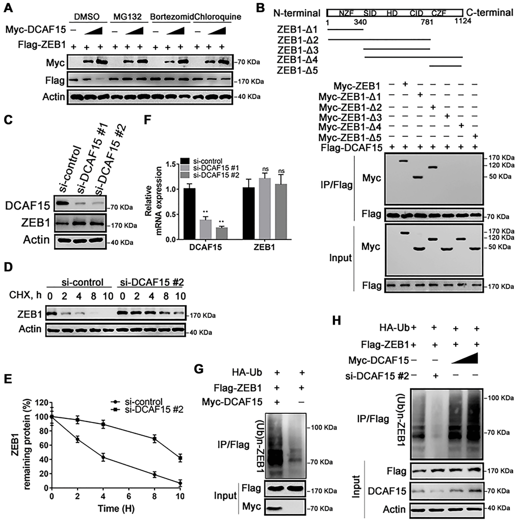 The DCAF15 and ZEB1 cDNAs were purchased from Genechem and subcloned into pCMV-Flag or pCMV-Myc expression vectors, respectively. ZEB1 deletion mutants were generated by PCR, and subcloned into pCMV-Myc expression vectors. All the constructs were confirmed by DNA sequencing.