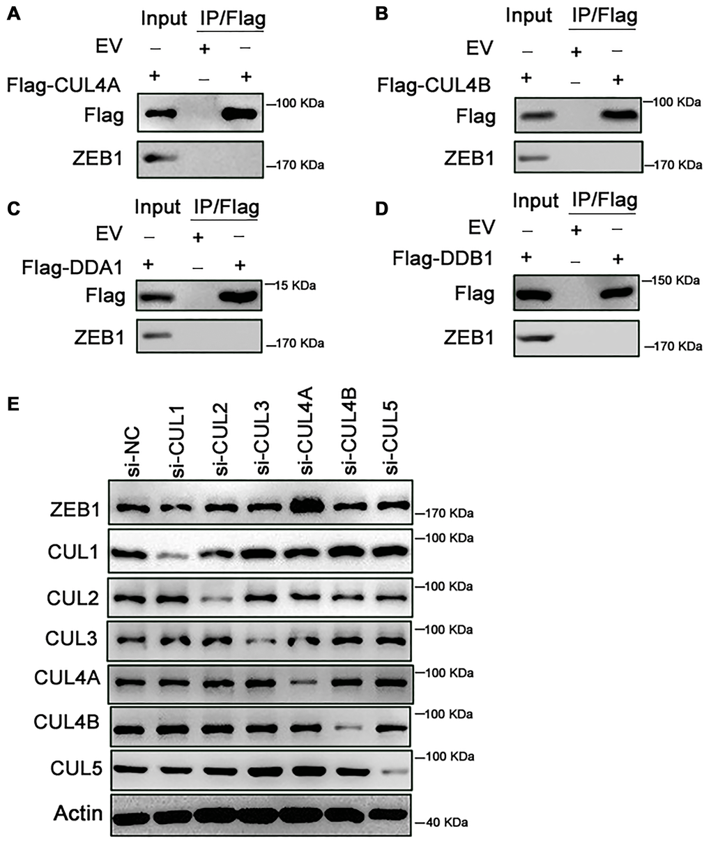 Ubiquitin is conjugated to its substrates by Cullin RING ligases (CRLs), which are multi-subunit ubiquitin ligases. CRLs are modular complexes that contain a common catalytic core but assemble with a diverse set of receptors that recruit specific substrates to the CRL’s catalytic complex [6]. Within CRL4 (CUL4A and CUL4B), DDB1 and DDA1 are adaptors, while DCAF15 is a substrate-specific receptor [7]. We first tested whether CUL4A binds ZEB1 within cells. As shown in Figure 4A, ZEB1 was not immunoprecipitated by Flag-CUL4A, indicating no binding between ZEB1 and CUL4A (Figure 4A). Likewise, exogenous CUL4B did not bind ZEB1, nor did DDA1 or DDB1 (Figure 4B–4D). We only detected an interaction between endogenous ZEB1 and exogenous Flag-DCAF15 (Figure 2D). Moreover, when we knocked down endogenous CUL1, CUL2, CUL3, CUL4A, CUL4B or CUL5 using corresponding siRNAs in SMMC-7721 cells and then measured the levels of ZEB1 and Cullin family members, we found that when cells were transfected with siCUL4A, ZEB1 levels were significantly higher than control (Figure 4E). By contrast, transfection of siRNAs targeting other Cullin family proteins had no effect on ZEB1 levels. Thus, only CUL4A appears to affect the stability of ZEB1 protein.