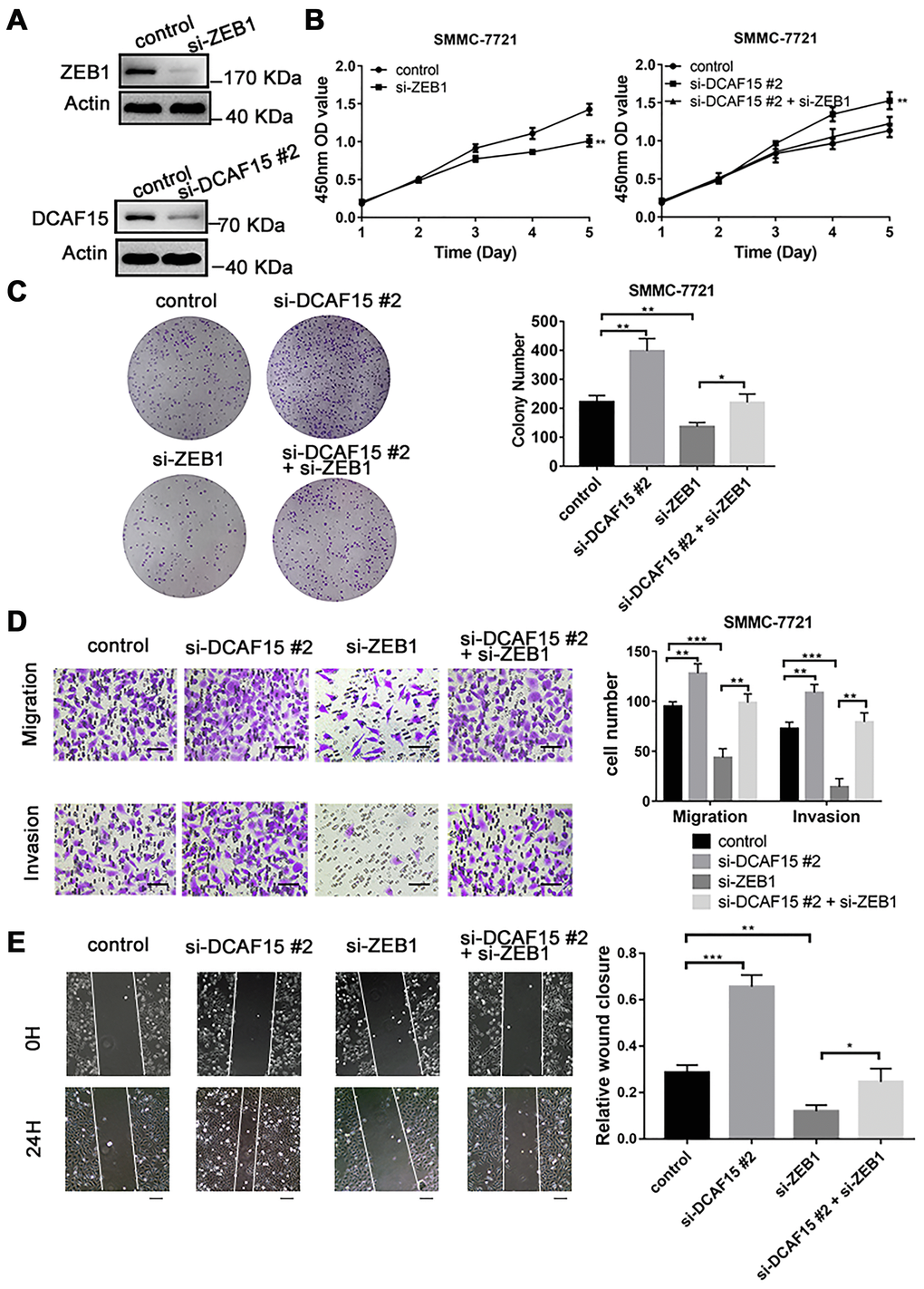To explore the biological function of the DCAF15-ZEB1 axis in HCC, siRNAs targeting DCAF15 and ZEB1 were transiently transfected into SMMC-7721 cells (Figure 5A), after which CCK8 and colony formation assays were performed. The results showed that cell proliferation was inhibited by ZEB1 knockdown but promoted by DCAF15 knockdown. Moreover, the enhanced cell proliferation caused by DCAF15 knockdown could be reversed by ZEB1 co-knockdown (Figure 5B–5C). This suggests DCAF15 inhibits HCC cell proliferation.