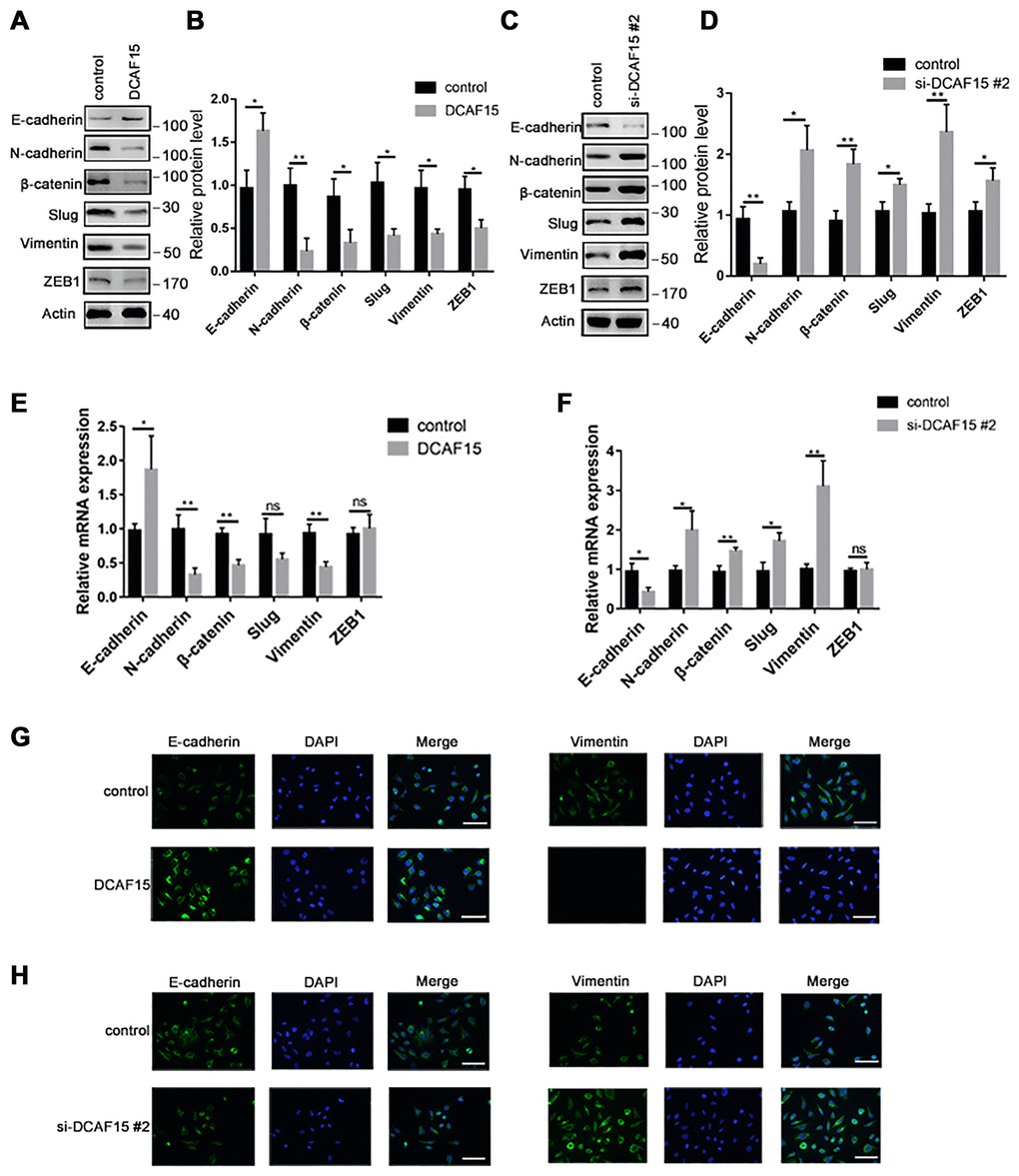 Numerous studies have reported that EMT is necessary for cancer metastasis [18, 19]. To become highly mobile, epithelial cells are known to lose their polarity, which helps them acquire migratory and invasive capabilities. Upon DCAF15 overexpression, E-cadherin was upregulated while several mesenchymal markers, including N-cadherin, β-catenin, slug and vimentin, were all downregulated (Figure 6A–6B, 6E and 6G). Conversely, E-cadherin was downregulated when DCAF15 expression was suppressed, and the mesenchymal signals were correspondingly upregulated (Figure 6C–6D, 6F and 6H).