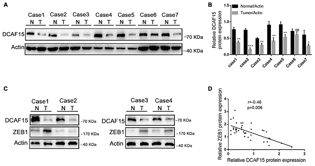 Cells were washed three times with 1× phosphate buffer saline (PBS) for 5 min, and then lysed with ice-cold radioimmunoprecipitation buffer containing a protease inhibitor cocktail (Sigma-Aldrich) for 30 min. And the lysate containing protein was centrifuged, then analysis with Western blot. Cell lysates or immune-precipitates were resolved by SDS-PAGE and proteins were transferred onto polyvinylidene difluoride membranes. The membranes were then maintained in 5% non-fat milk blocking for 2 h, and incubated with primary antibody for 12 h and followed by secondary antibody for 1h at room temperature. The proteins bands were visualized using ECL chemiluminescence system (Santa Cruz). The following antibodies were used: DCAF15 (SAB1103260, Sigma), ZEB1 (4C4, Novus), Myc (M4439; Sigma), Flag (F3165, Sigma), HA (M180-7; MLB), CUL1 (ab75817, Abcam), CUL2 (10981-2-AP, Proteintech), CUL3 (11107-1-AP, Proteintech), CUL4A (2715-S, EPITOMICS), CUL4B (12916-1-AP, Proteintech), CUL5 (ab34840, Abcam), and Actin (AC028; ABclonal). E-cadherin, N-cadherin, vimentin, β-catenin, and Slug antibodies were from CST (9782).