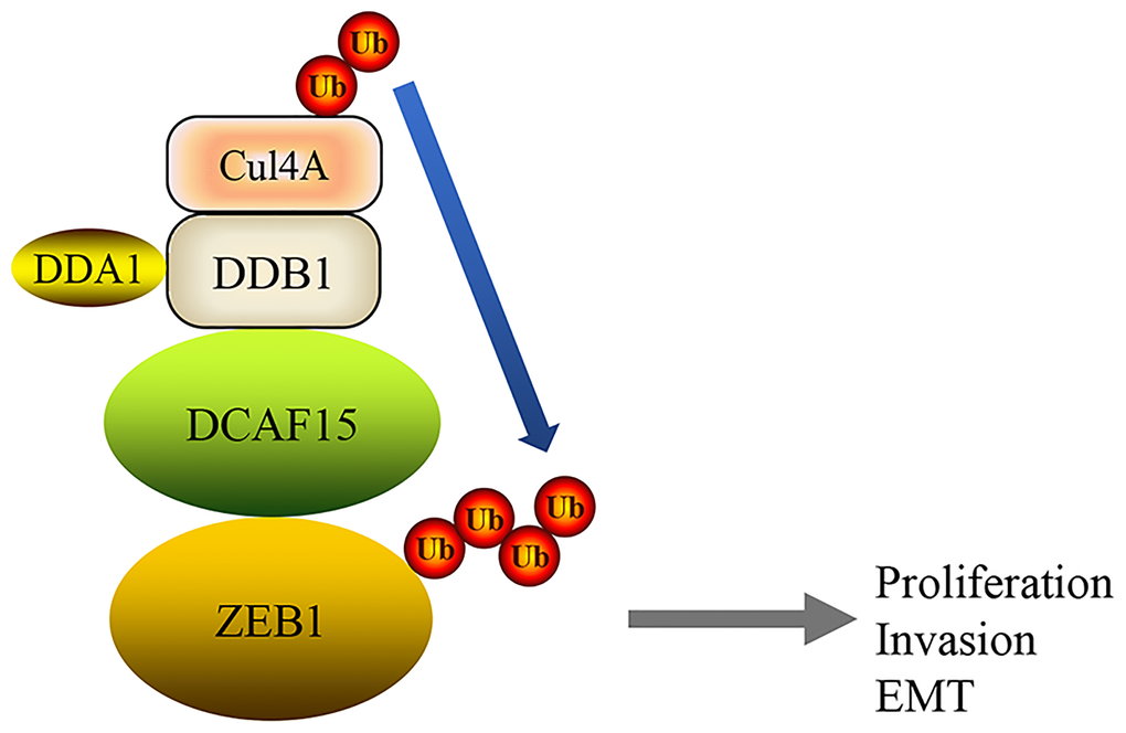 In this study, we showed that the DCAF15-CUL4 E3 ligase complex functions as a tumor suppressor that promotes ZEB1 ubiquitination and degradation, which suppresses malignant phenotypes such as cell proliferation, migration and invasion as well as EMT in HCC cells (Figure 8).
