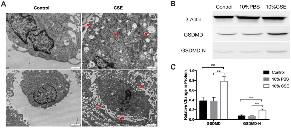 Our previous studies have demonstrated that cigarette smoke extract (CSE) exposure in a rat model system aggravated lumenal stenosis and induced inflammatory cytokine expression following balloon-induced carotid artery damage [19]. To further investigate the effect of CSE on human aortic endothelial cells (HAECs), we analyzed the classical pyroptosis-related pathway. We began by assessing the changes in cell morphology following CSE treatment. Morphological changes after CSE treatment were determined by transmission electron microscopy. As shown in Figure 1A, HAECs showed more autophagosomes, cytoplasmic outflow, cell membrane breakdown, and organelle edema. We then examined the protein expression level of Gasdermin D (GSDMD), the key executioner of the pyroptotic pathway, and the N-terminal GSDMD cleavage product (GSDMD-N), which is capable of inducing pyroptosis. Western blotting results showed that GSDMD and GSDMD-N were significantly rose following exposure to CSE relative to that in the control and PBS groups (Figure 1B, 1C). These results suggested that CSE treatment could induce pyroptosis in HAECs.