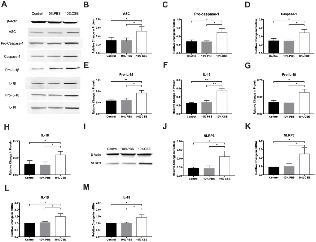 Pyroptotic cell death is associated with key morphological changes including the swelling of cells, osmotic lysis, and plasma membrane rupture [20]. Pyroptosis activation requires ASC dependent caspase-1, a key protein in the cleavage and secretion of active IL-1β and IL-18. We measured the expression of pyroptosis-associated molecules, including ASC, pro-caspase-1, caspase-1, pro-IL-1β, IL-1β, pro-IL-18, and IL-18 via western blotting. After CSE treatment, levels of all of these proteins rose significantly (Figure 2A–2H). Of several inflammasome complexes known to activate caspase-1, the most commonly evaluated is the NLRP3 inflammasome, which is a multiprotein platform that is activated upon cellular stress or infection. Western blotting results revealed that NLRP3 expression was remarkably elevated in the CSE group (Figure 2I, 2J). Real-time quantitative PCR assay results showed that CSE stimulation markedly enhanced NLRP3, IL-1β, and IL-18 expression relative to control (Figure 2K–2M). These experiments provide strong evidence for the NLRP3 inflammasome pathway as a mediator of CSE-induced pyroptosis in HAECs.