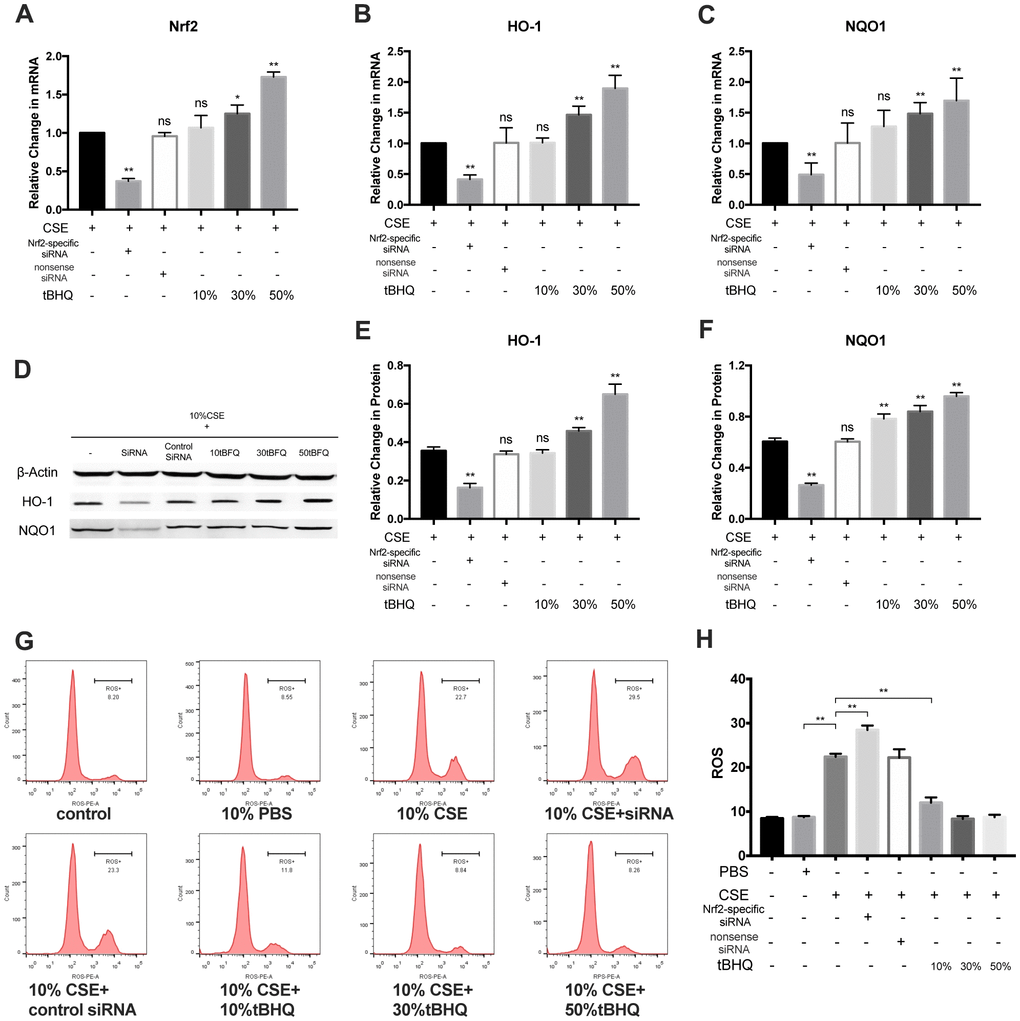 HAECs were from the Institute of Basic Medical Sciences (Chinese Academy of Medical Sciences and Peking Union Medical College) and were cultured at 37° C in Endothelial Cell Medium (ECM, ScienCell Research Laboratories, CA, USA) containing 10% FBS, 1% endothelial cell growth factors, and penicillin/streptomycin in 5% CO2 and 95% air. Cigarette smoke extract (CSE) was generated as in prior reports using six filtered cigarettes (10 mg tar, 0.9 mg nicotine, 12 mg CO) [57]. HAECs were treated with Nrf2 siRNA or various concentrations of tertiary butylhydroquinone (tBHQ) before exposure to CSE. After 24 h of pre-treatment, media was replaced with fresh media supplemented with 10% CSE.