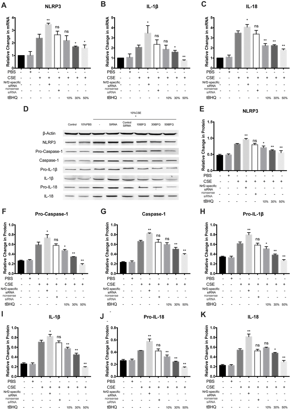 To explore how Nrf2 regulates the activation of the NLRP3 inflammasome, HAECs were pretreated with Nrf2-specific siRNA and the Nrf2 activator tBHQ before CSE treatment. The Nrf2, HO-1, and NQO1 mRNA levels were significantly inhibited in the Nrf2-specific siRNA group whereas they were stimulated in the tBHQ groups (Figure 4A–4C). The HO-1 and NQO1 protein levels were also remarkably downregulated by Nrf2 siRNA and upregulated by tBHQ treatment (Figure 4D–4F). In addition, the activation effect increased with increasing tBHQ concentration. We then detected the total ROS levels in each group by DHE staining. Fluorescence imaging indicated that pretreatment with Nrf2 siRNA could increase the ROS level, whereas pretreatment with tBHQ could reduce the ROS level. (Figures 4G, 4H). Further, the mRNA expression of NLRP3, IL-1β, and IL-18 were also markedly increased in the Nrf2-specific siRNA group and decreased in the tBHQ groups (Figure 5A–5C). NLRP3, pro-caspase-1, caspase-1, pro-IL-1β, IL-1β, pro-IL-18, IL-18, IL-1β, and IL-18 protein levels increased in the Nrf2-specific siRNA group and decreased in the tBHQ groups (Figure 5D–5K). These data show that the ROS levels and NLRP3 inflammasome are negatively regulated by the Nrf2 pathway.