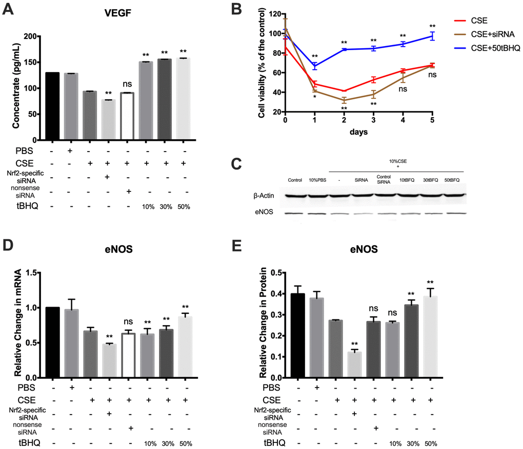VEGF is a mitogenic factor that selectively drives endothelial cell growth, vascular permeability, and angiogenesis [23]. In this study, analysis of VEGF protein expression by ELISA revealed lower levels of VEGF in the CSE group relative to the control and PBS groups; further, Nrf2 could positively regulate the expression of VEGF (Figure 6A). To further demonstrate the cytotoxic effect of CSE against HAECs, the effect of CSE on the viability of HAECs at 1–5 days after treatment was analyzed using the CCK8 assay. Cell viability in the CSE group was decreased relative to controls; further, cell viability was improved in the tBHQ-treated groups but was decreased in the Nrf2-specific siRNA group relative to the CSE group (Figure 6B). eNOS is an essential regulator of endothelial function, serving as a key regulator of homeostasis and vascular tone by catalyzing NO production [24]. As shown in Figure 6C–6E, CSE treatment effectively downregulated eNOS at both the mRNA and protein levels, whereas Nrf2 could increase the expression level of eNOS. These results suggest that CSE induces a marked drop in cell viability and the expression of VEGF and eNOS in HAECs, and that these outcomes may be prevented by activating the Nrf2-related pathway.