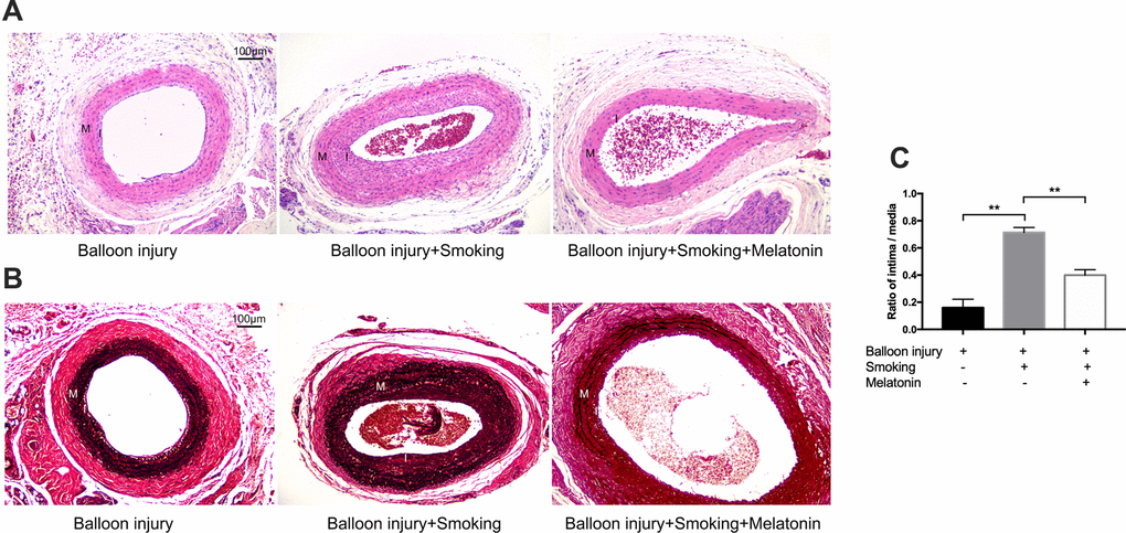 Rats were randomized into a 3 groups (10 per group): control, smoking, and melatonin groups. All rats underwent balloon-induced carotid artery injury. Rats in the control group were exposed to air and administered DMSO, while rats in the smoking group were exposed to cigarettes smoke and administered DMSO, and rats in the melatonin group were exposed to cigarette smoke and administered melatonin (Sigma-Aldrich, MO, USA). Rats exposed to cigarette smoke were exposed to the equivalent smoke from 20 cigarettes per day (10 mg tar, 0.9 mg nicotine, 12 mg CO) over 120 minutes (from 9:00–10:00 and 15:00–16:00). Melatonin was prepared in normal saline containing 5% DMSO and diluted with saline prior to injection at 10 mg/kg/day (i.p.) [56]. Seven days after smoke exposure, the three groups were subjected to a previously detailed balloon-induced carotid artery injury [19]. At the 4th week following injury, animals were euthanized with pentobarbital sodium injection, and 2 cm carotid artery samples were separated and harvested. The samples were then fixed with 4% paraformaldehyde (PFA) 24 h or stored in liquid nitrogen.