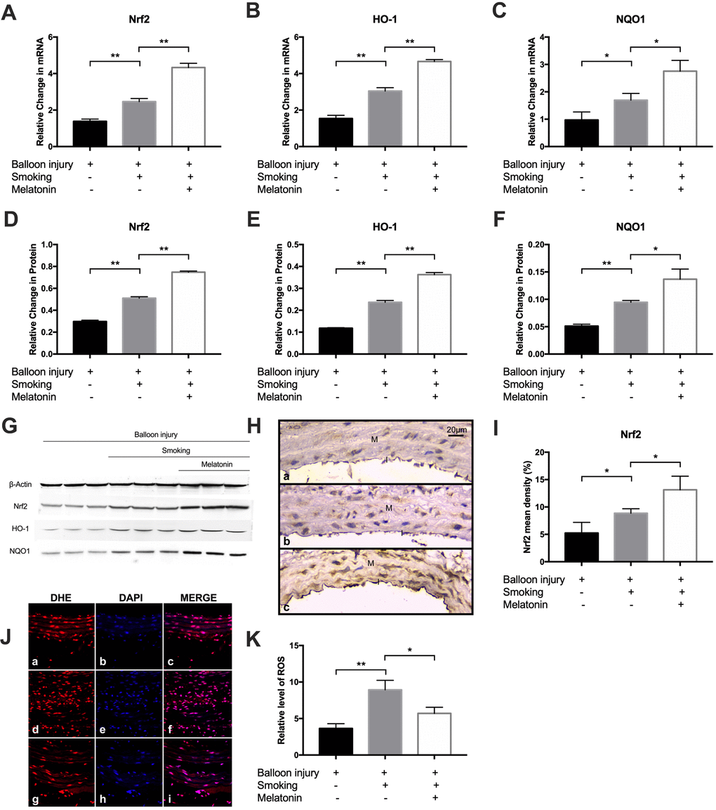We then investigated the impact of melatonin on the induction of Nrf2 expression in response to cigarette smoke in vivo. The mRNA and protein levels of Nrf2/HO-1 pathway components in the carotid arteries of the three groups was evaluated via RT-PCR and western blotting, respectively, following cigarette smoke exposure for 4 weeks. A marked rise in Nrf2, HO-1, and NQO1 expression was observed in the smoking group relative to controls; melatonin further promoted Nrf2/HO-1 pathway component expression (Figure 8A–8G). Immunohistochemical staining for Nrf2 showed that Nrf2 immunopositivity was localized to endothelial cells and vascular smooth muscle cells in the intima (cytoplasmic). The results showed a significantly increased level of Nrf2 in the melatonin group than in the smoking group (Figure 8H, 8I). Next, we explored carotid artery ROS levels using the fluorescent probe, DHE. Notably, controls exhibited low basal ROS levels. However, ROS generation was increased markedly in the smoking group, and this effect was reduced upon treatment with melatonin (Figure 8J, 8K). These data show that melatonin treatment inhibits smoking-induced ROS generation.