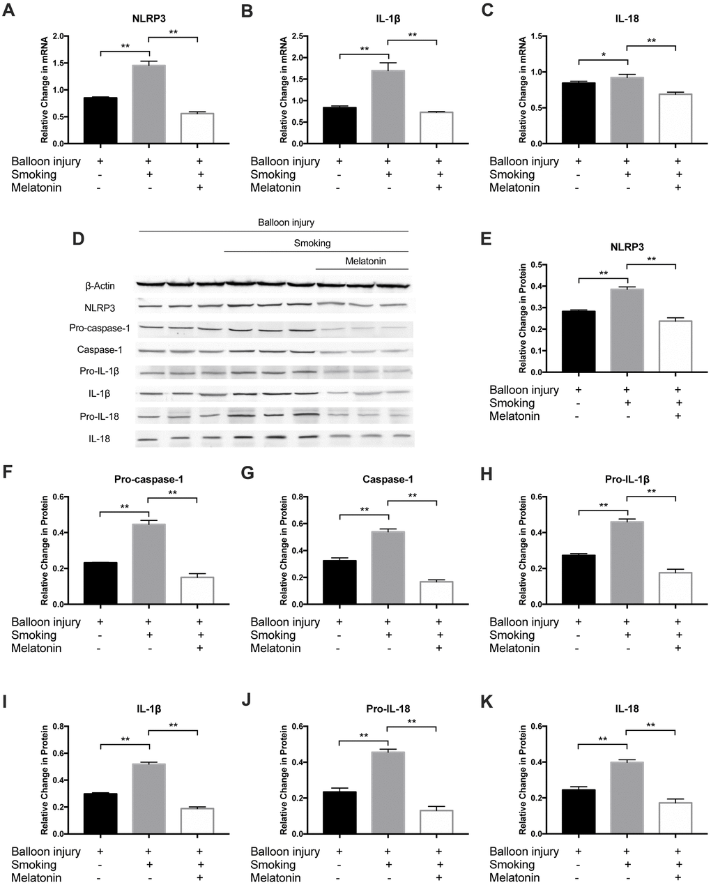 Moreover, to further validate the effect of melatonin on smoking-induced inflammatory cytokines, the NLRP3 inflammasome and downstream inflammatory factors were detected after cigarette smoke exposure for 4 weeks. Relative to the smoking group, NLRP3, IL-1β, and IL-18 mRNA levels were markedly decreased in the melatonin group (Figure 9A–9C). Western blot analysis revealed decreased NLRP3, pro-caspase-1, caspase-1, pro-IL-1β, IL-1β, pro-IL-18, and IL-18 protein levels in the melatonin group (Figure 9D–9K). As such, exposure to cigarette smoke can remarkably increase inflammation within carotid arteries, while melatonin protects against such injury via suppressing NLRP3 inflammasome activation.