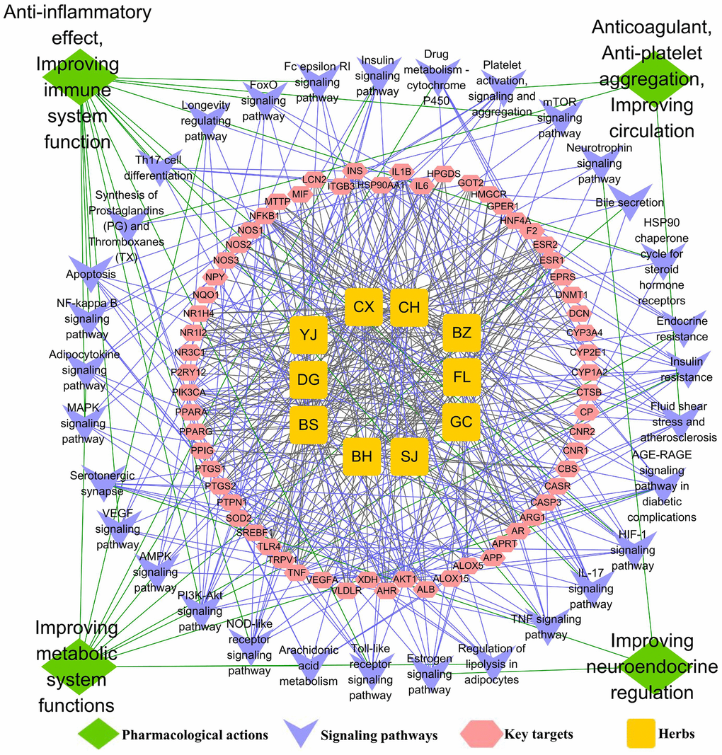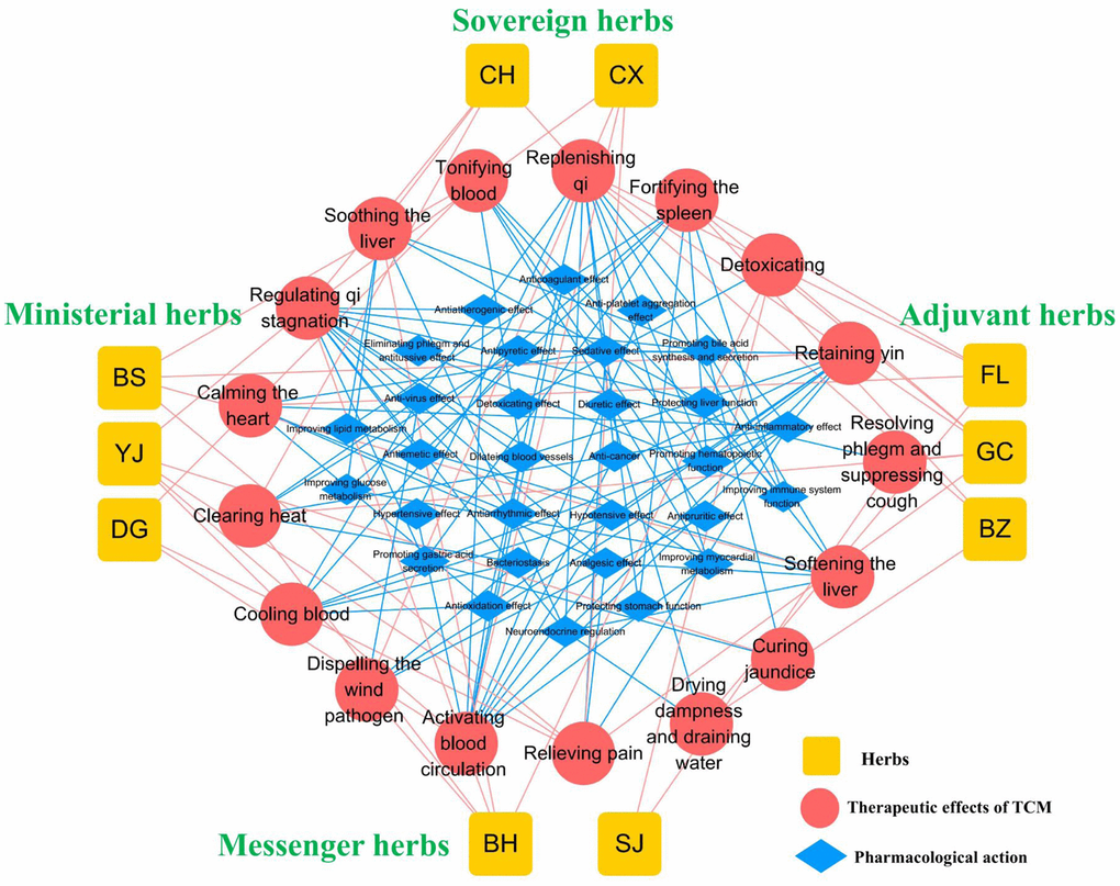 According to the TCM theory, the ten herbs in TGLQ can be classified as sovereign, ministerial, adjuvant and messenger herbs. CH and CX, as sovereign herbs, play the main roles in the TCM therapeutic effects of soothing the liver, regulating qi and activating blood circulation, thus mainly corresponding to the pharmacological mechanisms of anti-inflammation, anti-platelet aggregation, improving lipid and glucose metabolism, improving the immune system and antiatherogenic effects. BS, DG and YJ, as ministerial herbs, enhance the TCM therapeutic effects of sovereign herbs. In addition, BS and DG can tonify blood, corresponding to the enhancement of immune-system function and the promotion of hematopoietic function. FL, BZ and GC, as adjuvant herbs, play the main roles in the TCM therapeutic effects of fortifying the spleen, replenishing qi and drying dampness, corresponding to the pharmacological mechanisms of protecting stomach function, improving immune-system function, improving lipid and glucose metabolism, regulating the neuroendocrine system and diuretic effects. BH and SJ, as messenger herbs, guide herbs into the associated meridians. The BH TCM therapeutic effect of soothing the liver is consistent with that of CH, while the BH TCM therapeutic effect of clearing heat is associated with the pharmacological mechanism of antipyretic and anti-inflammatory effects. The SJ TCM therapeutic effects of resolving phlegm and suppressing coughs are associated with the pharmacological mechanism of eliminating phlegm and antitussive effects (Figure 1).