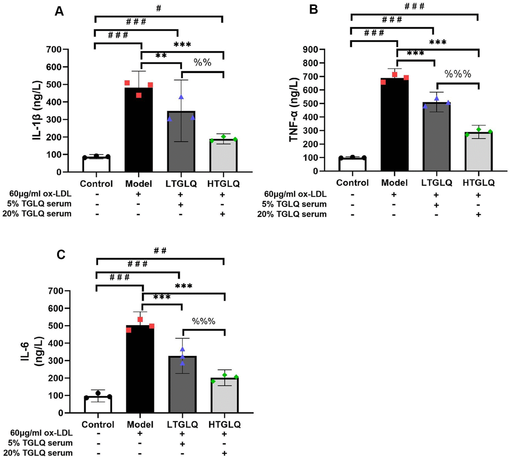 In order to investigate the inflammatory response, we detected the levels of TNF-α, IL-1β and IL-6 in a culture medium. The results showed that, compared with the control group, the levels of IL-1β, TNF-α, and IL-6 were significantly increased in the model group (all P < 0.001). Moreover, results demonstrated that the addition of low-dose TGLQ treatment to macrophages treated with ox-LDL significantly decreased the levels of IL-1β, TNF-α and IL-6, as compared with the model group (LTGLQ group: IL-1β, P < 0.01; TNF-α, P < 0.001; IL-6, P < 0.001). Meanwhile, the addition of high-dose TGLQ treatment to macrophages treated with ox-LDL significantly decreased the levels of IL-1β, TNF-α and IL-6 compared with the model group (all P < 0.001). Furthermore, compared with the LTGLQ group, the levels of IL-1β, TNF-α and IL-6 were decreased significantly in the HTGLQ group (IL-1β, P < 0.01; TNF-α, P < 0.001; IL-6, P < 0.001). The results above indicated that TGLQ could suppress the production of TNF-α, IL-1β and IL-6 in macrophages stimulated by ox-LDL (Figure 10A–10C).