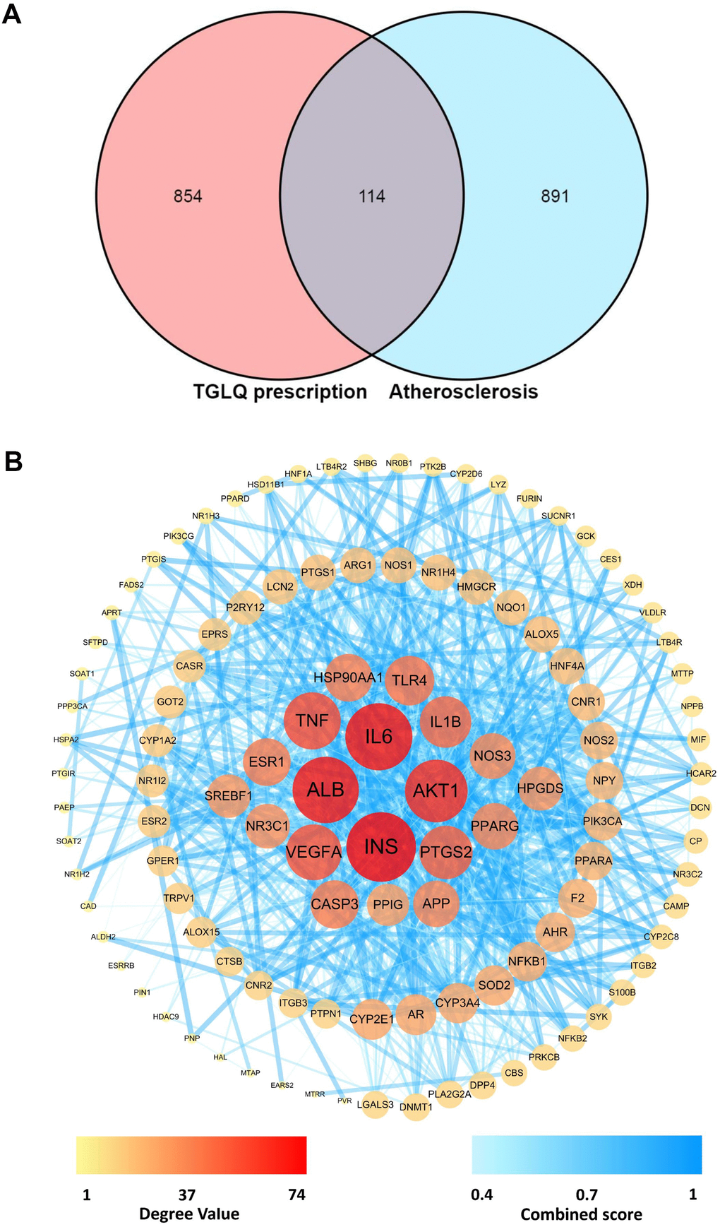 In conclusion, the main findings in this study were as follows: (1) A total of 548 chemical compounds contained in TGLQ and 969 putative targets were screened from TCMIP; (2) A total of 1005 therapeutic targets for the treatment of AS were obtained from DisGeNET, TTD and CTD; (3) The 63 key targets were screened by network topological analysis, and functional enrichment analysis showed that the key targets were associated with immune system and inflammation, lipid-and-glucose metabolism, neuroendocrine system and anti-thrombosis effect; (4) The in vivo experiments confirmed that TGLQ could significantly decrease plasma lipid profiles and plasma inflammatory cytokines, and inhibit the AS plaque formation of the AS model ApoE-/- mice; (5) The in vitro experiments showed that TGLQ could significantly reduce intracellular lipid accumulation, and also suppress the production of the inflammatory cytokines of macrophages, induced by ox-LDL, that were associated with TLR4 and HSP90.