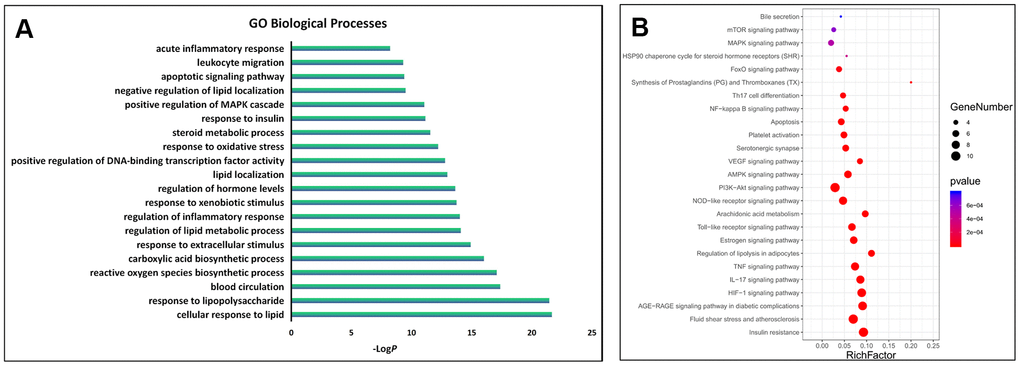 Metascape (http://metascape.org/) is a database and platform with appropriate timeliness and accuracy, which integrates Gene Ontology (GO), the Kyoto Encyclopaedia of Genes and Genomes (KEGG), UniProt and other databases. It can be used for GO analysis, KEGG and Reactome signalling-pathway analysis. By uploading the targets to Metascape and setting the parameter as “H species”, the results of the enrichment analysis for the GO biological process and the KEGG signalling-pathway analysis were obtained. Top ranked biological processes and pathways were analysed and screened according to their physiological and pharmaceutical importance. (Omicshare https://www.omicshare.com/tools/) was applied to visualize the results above.