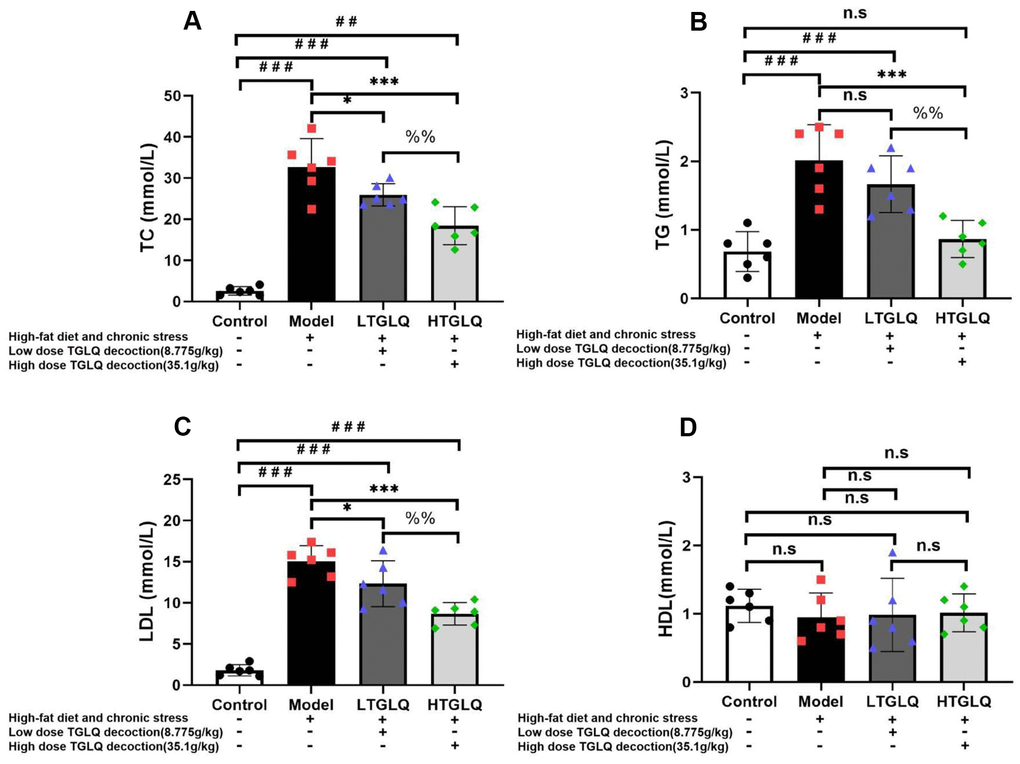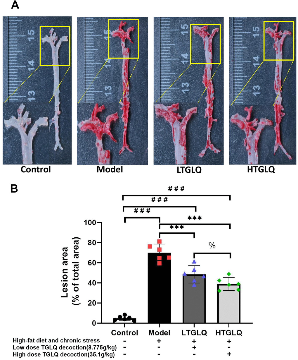 Animal studies were conducted in compliance with the ARRIVE guidelines, with the approval of the Local Ethical Committee (Guangzhou University of Chinese Medicine). Male C57BL/6 (n = 6, 4 weeks old, weight 17-20g) and male Apolipoprotein E-deficient (ApoE-/-) mice (n = 18, 4 weeks old, weight 17-20g, C57BL/6 background) were purchased from the Model Animal Research Centre, Nanjing University, Nanjing, China. Before the beginning of the experiments, all the mice were kept in rooms under controlled laboratory conditions (23-25° C, 12:12h light-dark cycle, 50%-70% humidity) and fed with approved ordinary chow for at least 7 days along with free access to water. In line with our previous AS model construction [14], 30 ApoE-/- mice were intragastrically (ig) injected with 0.2 ml of high-fat emulsion daily (including 10% lard oil, 10% tween-80, 10% propylene glycol, 5% cholesterol, 1% sodium cholate, 1% propylthiouracil, and purified water), and stimulated with chronic stressors (including ice-water swimming for 30s-60s, day and night inversion for 12 h respectively, fettering for 6 h, cage inclination to 45 degrees, water deprivation for 24 h, and food deprivation for 24 h) with a frequency of a six-day cycle, for 16 weeks. On the last day of the 8th week of model construction, the 18 ApoE-/-mice were randomly divided into 3 groups (n=6 in each group), including the model group (model, intragastrically injected with 1ml normal saline daily), the low-dose TGLQ group (LTGLQ, intragastrically injected with 8.775g/kg daily) and the high-dose TGLQ group (HTGLQ, intragastrically injected with 35.1g/kg daily). The duration of the TGLQ treatment was 8 weeks.