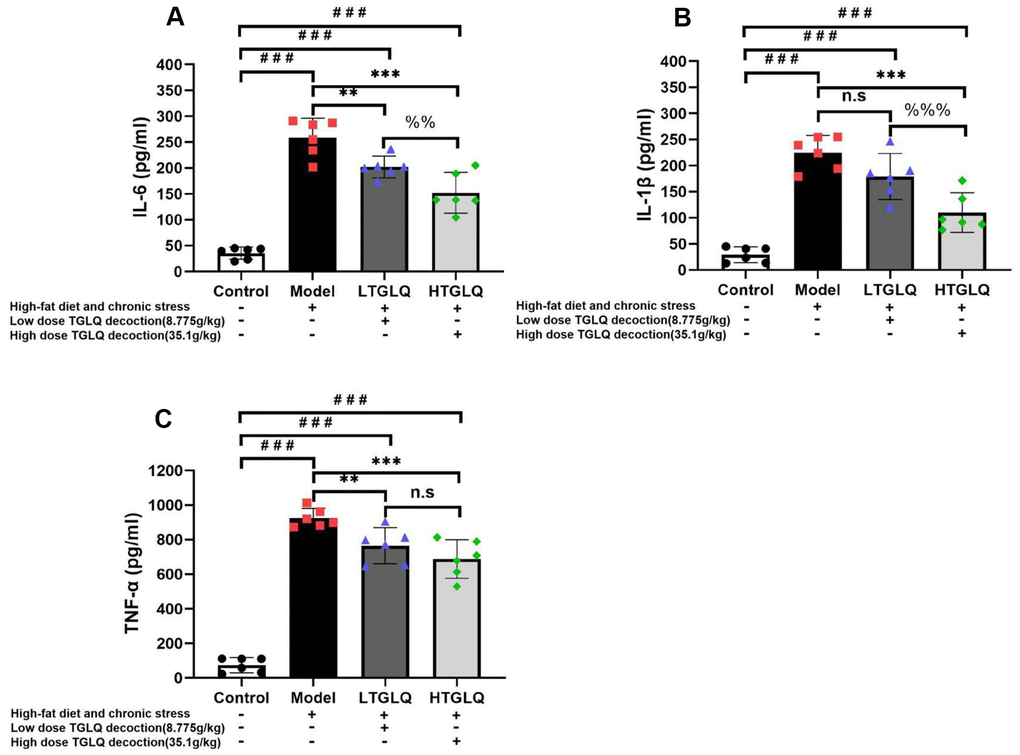 In order to investigate the inflammatory response, we detected the plasma levels of TNF-α, IL-1β and IL-6. As shown in Figure 7, the plasma levels of TNF-α, IL-1β and IL-6 increased significantly in the model group compared with those in the control group (all P < 0.001). Furthermore, the addition of low-dose TGLQ to AS model ApoE-/- mice significantly reduced the levels of TNF-α and IL-6 compared with the model group (all P < 0.01). Moreover, the addition of high-dose TGLQ to AS model ApoE-/- mice significantly reduced the levels of TNF-α, IL-1β and IL-6 compared with the model group (all P < 0.001). Additionally, the HTGLQ group evinced a significant reduction in the levels of IL-6 and IL-1β compared with the LTGLQ group (IL-1β, P < 0.01; IL-6, P < 0.001). Thus, the results above suggested that TGLQ could suppress the plasma levels of TNF-α, IL-1β and IL-6 in AS model ApoE-/- mice.