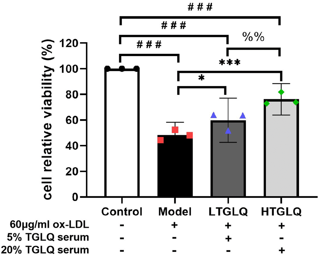 After 8 h of starvation in serum-free DMEM, the cells were randomly divided into four different groups: a control group, model group, LTGLQ group (low-dose TGLQ treatment group, containing 5% TGLQ serum) and HTGLQ group (high-dose TGLQ treatment group, containing 20% TGLQ serum). Unlike the control group, the other three groups were exposed to 60μg/ml oxidized-LDL (ox-LDL) (Yiyuan Biotechnology, Guangzhou, China) for 24 h as previously indicated [47]. Control serum was added to the model group, while 5% and 20% concentration TGLQ serum were separately added to the LTGLQ group and the HTGLQ group, respectively.
