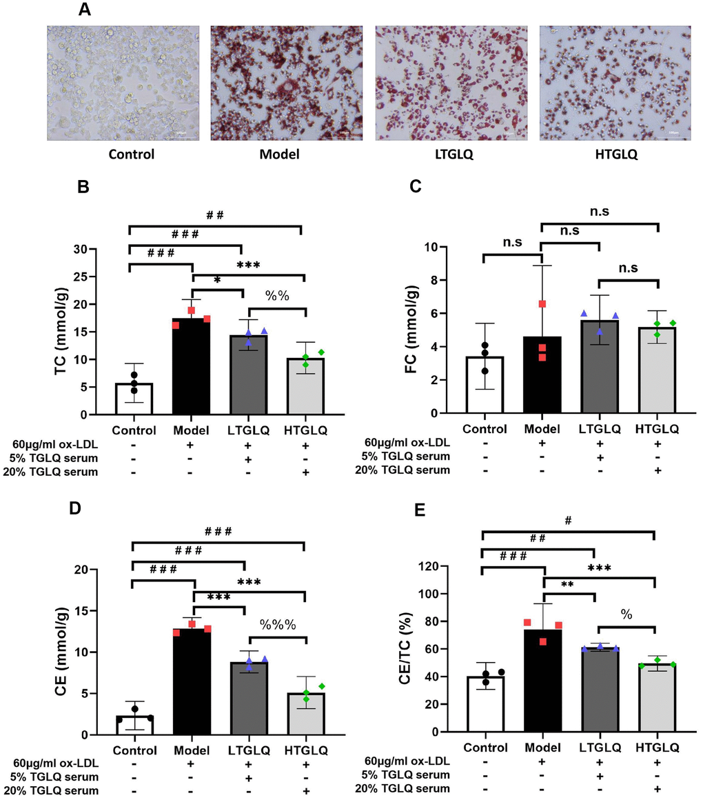 To investigate the accumulation of lipid, we conducted oil red O staining, and detected the levels of TC, FC and CE in a culture medium. Oil red O staining showed that there was a large amount of red staining lipid accumulation in the model group, compared with the control group (Figure 9A). In addition, TC, CE and CE/TC (> 50%) were increased significantly in the model group compared with their respective levels in the control group (all P < 0.001). Furthermore, the results of oil red O staining showed that the addition of TGLQ to macrophages treated with ox-LDL (the LTGLQ and HTGLQ group) significantly decreased lipid accumulation compared with the model group. Moreover, compared with the model group, the levels of TC, CE and CE/TC were decreased significantly in the LTGLQ group (TC, P < 0.05; CE, P < 0.001; CE/TC, P < 0.01) and the HTGLQ group (all P < 0.001). Additionally, compared with the LTGLQ group, the levels of TC, CE and CE/TC were decreased significantly in the HTGLQ group (TC, P < 0.01; CE, P < 0.001; CE/TC, P < 0.05). Therefore, the results above suggested that TGLQ could reduce intracellular lipid accumulation of macrophages induced by ox-LDL (Figure 9B–9E).