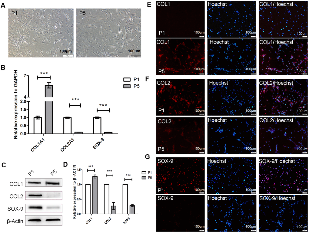 To confirm whether human hyaline chondrocytes undergo dedifferentiation in vitro, we collected and cultured primary chondrocytes from three donors. During passage, the shapes of the human hyaline chondrocytes gradually changed from polygonal, or near circular, to flat and long or spindly (Figure 1A). Compared with passage one (P1) chondrocytes, COL2A1 and SOX-9 expression was significantly downregulated (P < 0.001), while COL1A1 was upregulated (P < 0.001, Figure 1B), in P5 chondrocytes. Moreover, COL2 and SOX-9 levels were significantly lower in P5 than in P1 chondrocytes, while COL1 levels were significantly higher in P5 chondrocytes compared to P1 chondrocytes (P < 0.001, Figure 1C–1G). These results suggest that dedifferentiation of cultured human hyaline chondrocytes occurs during cell passage in vitro. P1 chondrocytes therefore served as differentiated chondrocytes, while P5 chondrocytes served as dedifferentiated chondrocytes, in subsequent experiments.
