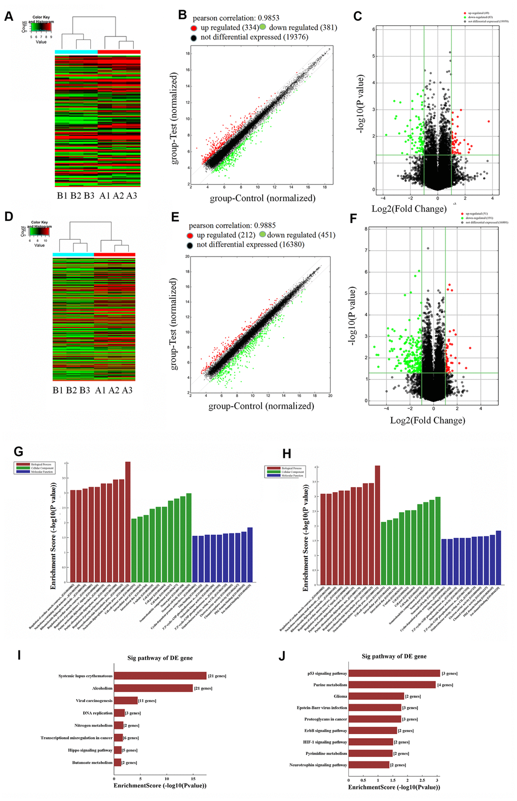 The Arraystar Human LncRNA Microarray (v4.0) was used to detect the expression of 40,173 lncRNAs and 20,730 coding transcripts. Hybridized arrays were washed, fixed, and scanned using the Agilent DNA Microarray Scanner System (part number G2505C). Agilent Feature Extraction software (version 11.0.1.1) was used to analyze the acquired array images. Pathway analysis and GO analysis were used to determine the roles of the differentially expressed mRNAs in the biological pathways or GO terms. Hierarchical clustering and combined analysis were performed using in-house scripts.