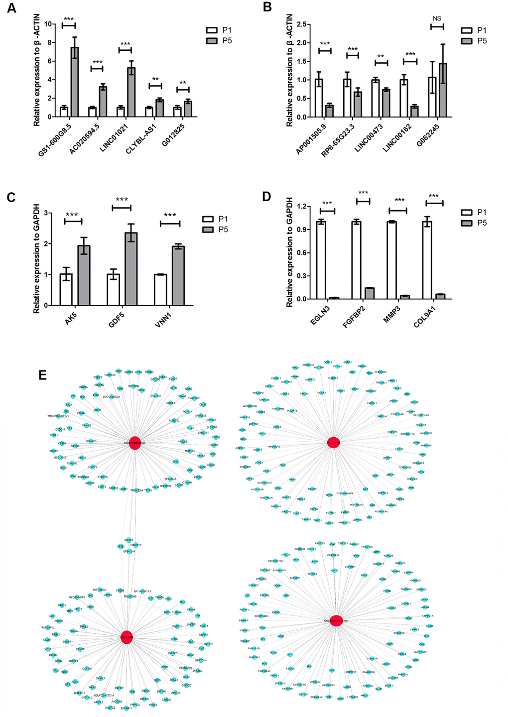 We selected ten differentially expressed lncRNAs and seven differentially expressed mRNAs for further analysis. The selection criteria for differentially expressed lncRNAs were as follows: (1) high fold-change in expression with smaller P value; (2) raw intensity more than 200; (3) lncRNA length generally less than 2000 bp; (4) no sense-overlap lncRNAs. Ultimately, CLYBL-AS1, LINC01021, G012825, GS1-600G8.5, and AC020594.5, which were upregulated in P5 chondrocytes, and AP001505.9, RP6-65G23.3, LINC00473, LINC00162, and G062245, which were downregulated, were analyzed further. We performed real-time qPCR on P1 and P5 chondrocytes isolated from three donors to quantify the expression of the selected lncRNAs and mRNAs. Except for G062245 (T268788), qPCR results were consistent with microarray analysis results for the selected lncRNAs. LINC01021 (NR_038848) and GS1-600G8.5 (ENST00000412485) showed the largest fold increases in expression among the lncRNAs in the qPCR analysis (P < 0.001, Figure 3A), while AP001505.9 (ENST00000569966, LINC00165) and LINC00162 (NR_024089) showed the largest fold decreases (P < 0.001, Figure 3B). In addition, qPCR expression results were consistent with microarray analysis results for all selected mRNAs. Specifically, expression of AK5, GDF5, and VNN1 was upregulated, while expression of EGLN3, FGFBP2, MMP3, and COL9A1 was downregulated, during chondrocyte dedifferentiation (P < 0.001, Figure 3C, 3D). These results confirmed the accuracy of the microarray analysis results. Next, we examined the gene co-expression networks of AP001505.9, LINC00162, LINC01021, and GS1-600G8.5 to identify potential target genes for future research (Figure 3E). These lncRNAs may promote or inhibit the dedifferentiation of human hyaline chondrocytes by promoting or inhibiting the expression of the associated coding genes.