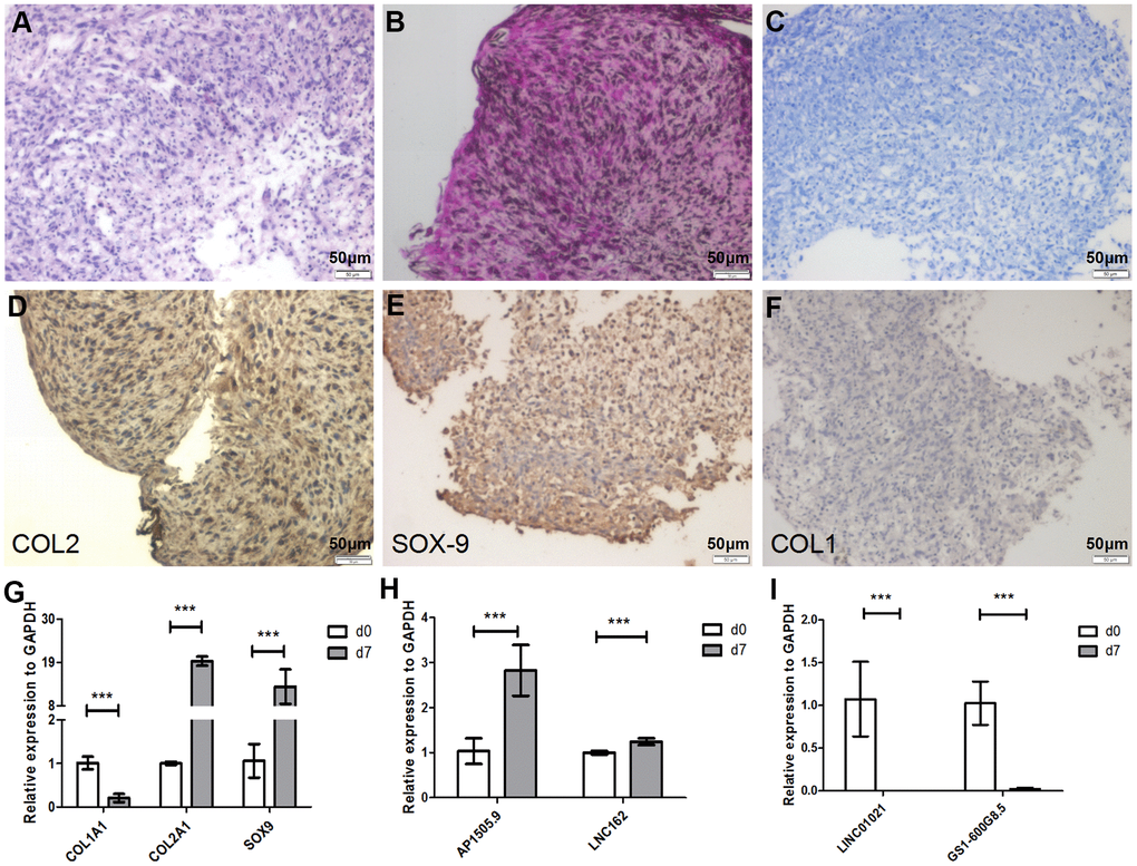 Dedifferentiated chondrocytes can be redifferentiated using pellet culture [21]. To further clarify whether changes in lncRNA expression that occur during chondrocyte redifferentiation can be reversed, P5 chondrocytes were cultured in pellet culture in vitro for 7 days. After pellet culture, hematoxylin-eosin (HE) staining indicated that the cells exhibited typical hyaline chondrocyte characteristics (Figure 4A). We then examined the contents of the chondrocyte extracellular matrix using safranin O and Alcian blue staining. Cartilage staining intensity increased significantly in the extracellular matrix after pellet culture (Figure 4B, 4C). To determine whether the cultured chondrocytes were redifferentiated, we analyzed chondrocyte markers at the mRNA and protein levels. COL1A1 mRNA expression was significantly downregulated, while COL2A1 and SOX-9 expression were significantly upregulated, after pellet culture (P < 0.001 Figure 4G). At the protein level, COL2 and SOX-9 expression were significantly upregulated, while COL1 expression was significantly downregulated (Figure 4D–4F), after pellet culture. This suggests that dedifferentiated P5 chondrocytes can be redifferentiated using pellet culture.