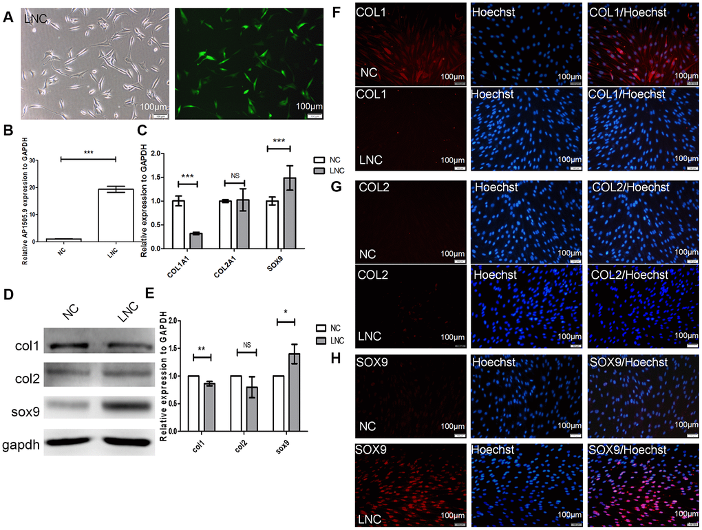 AP001505.9 was downregulated during dedifferentiation and upregulated during redifferentiation. To further analyze the effects of AP001505.9 on the expression of the chondrocyte marker genes COL1A1, COL2A1, and SOX9, we transfected P5 chondrocytes with lentiviruses that induced overexpression of AP001505.9. Fluorescence microscopy indicated an 80% transfection efficiency (Figure 5A). Real-time qPCR showed that AP001505.9 expression increased approximately 20-fold (P < 0.001, Figure 5B), confirming successful lentiviral transfection. We next examined the effects of AP001505.9 overexpression on chondrocyte phenotype and dedifferentiation. The RT-qPCR results indicated that AP001505.9 overexpression significantly upregulated SOX9 expression and downregulated COL1A1 expression (P < 0.001); no significant change was observed in COL2A1 expression (P > 0.05, Figure 5C). The same expression changes for SOX9 and COL1, as well as the lack of change in COL2, were observed at the protein level (Figure 5D–5H). These results suggest that overexpression of AP001505.9 promoted maintenance of the hyaline chondrocyte phenotype and inhibited dedifferentiation in chondrocytes.