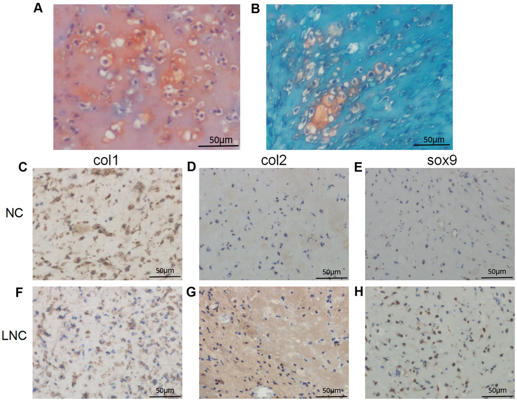 BALB/C A-nu nude mice (male, 4–5 weeks old, about 15 g) were purchased from Beijing HFK BioScience Co. Ltd. All animal experiments were approved by the Animal Experiment Ethics Committee of the Basic Medical College of Jilin University (2019081). Intraperitoneal injection of 0.8% pentobarbital sodium was used for anesthesia. Using 100 μL of porcine fibrin sealant kit (Guangzhou Bioseal Biotech Co. Ltd., China) as the scaffold material, P5 chondrocytes transfected with LV-AP001505.9 (1 × 106) were transplanted into the left dorsal subcutaneous tissue of ten male nude mice. The same number of chondrocytes transfected with negative control (NC)-lentivirus were transplanted into the right dorsal subcutaneous tissue of the same mice. One month later, all mice were sacrificed, and tissue samples were collected for histological and immunohistochemical analysis.