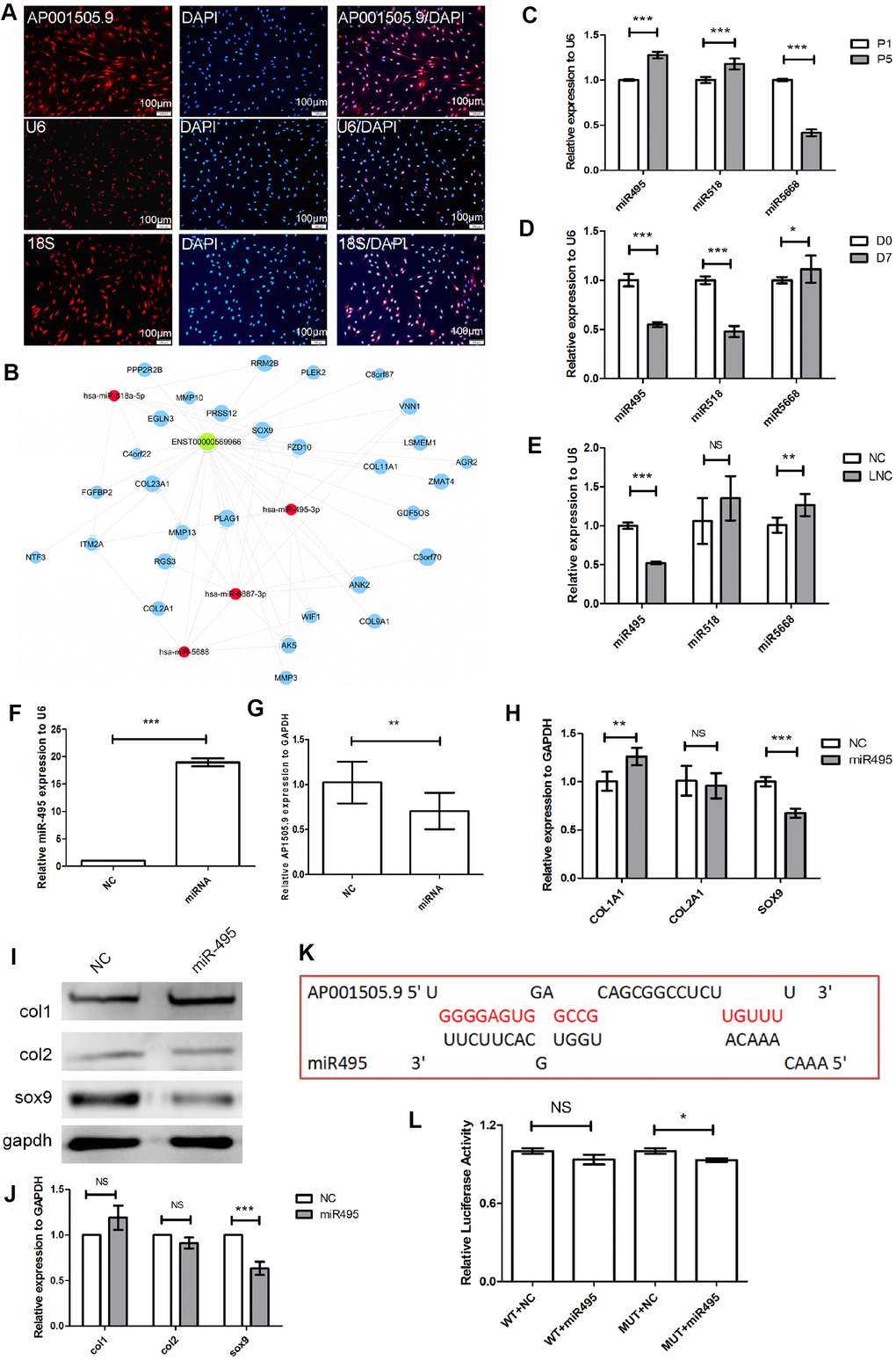 To investigate the specific mechanism by which AP001505.9 inhibits hyaline chondrocyte dedifferentiation, we first examined its cellular sublocalization using 18S as the positive control probe for the cytoplasm and U6 as the positive probe for the nucleus. The results showed that AP001505.9 expression was localized to both the nucleus and the cytoplasm (Figure 7A). To explore whether AP001505.9 promoted SOX-9 expression through competitive binding of related miRNAs, we selected genes related to cartilage differentiation, miRNAs, and AP001505.9 for competing endogenous RNA (ceRNA) analysis. Results showed that AP001505.9 may regulate SOX-9 expression by competing with four miRNAs: hsa-miR-495-3p, hsa-miR-518a-5p, hsa-miR-5688, and hsa-miR-6887-3p (Figure 7B). Furthermore, real-time qPCR results showed that miR-495-3p and miR-518a-5p expression were significantly upregulated during dedifferentiation of human chondrocytes, while miR-5688 expression was significantly downregulated (P < 0.001, Figure 7C). MiR-495-3p and miR-518a-5p expression were also significantly downregulated after redifferentiation (P < 0.001, Figure 7D). Meanwhile, overexpression of AP001505.9 inhibited miR-495-3p expression (P < 0.001) and had no significant impact on miR-518a-5p and miR-5688 expression (P > 0.05, Figure 7E). These results suggest that AP001505.9 may promote SOX-9 expression by competing with miR-495-3p.