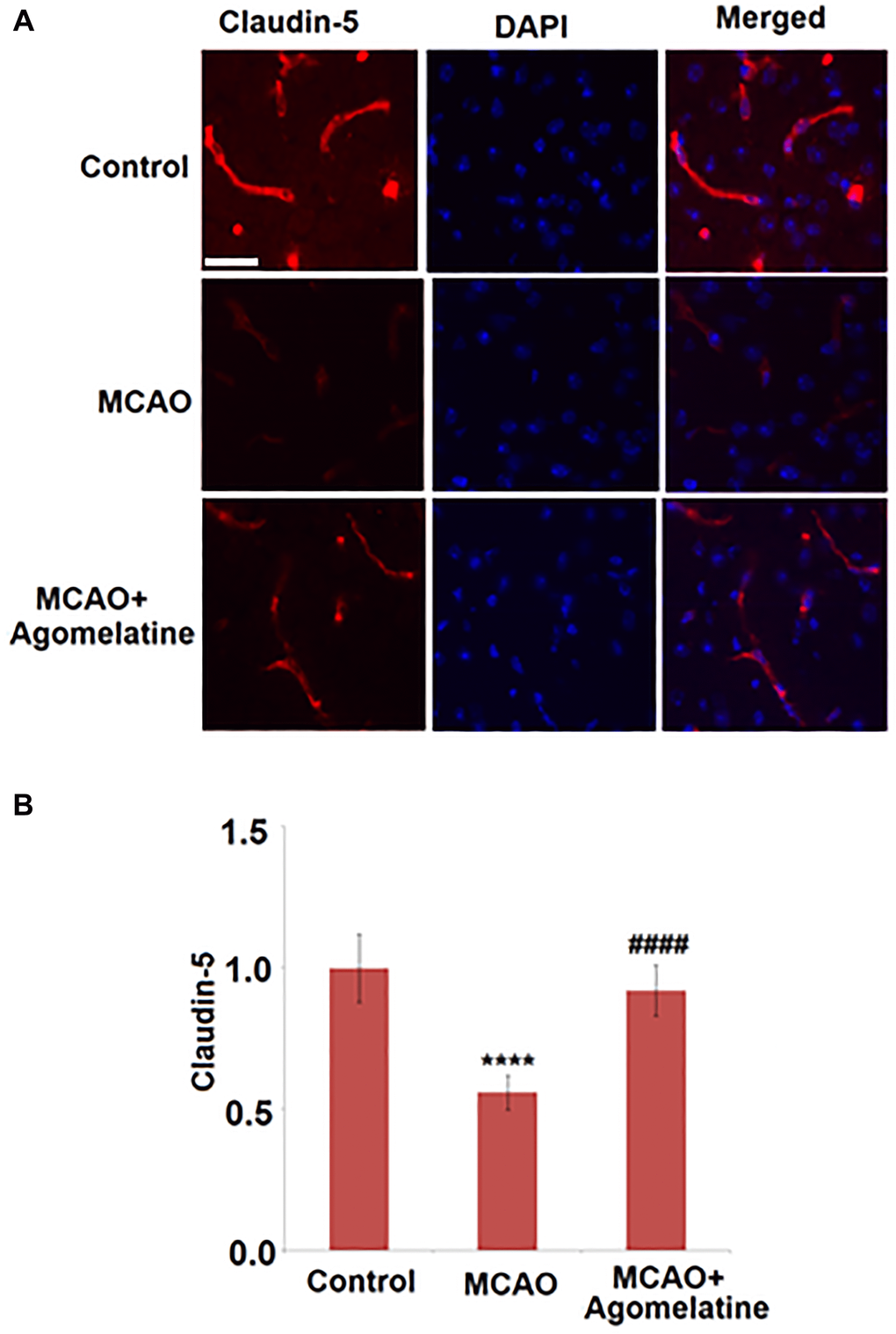 To explore the effects of Agomelatine on the tight junctions between endothelial cells in MCAO mice, the expression level of claudin-5 was evaluated. As shown in Figure 3, claudin-5 was significantly down-regulated in the cortex by MCAO modeling in mice but was greatly up-regulated by the introduction of Agomelatine, indicating that the damaged tight junction by MCAO modeling was repaired by Agomelatine.