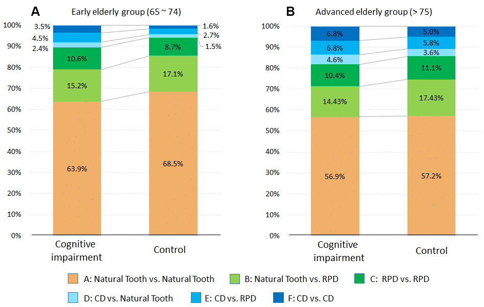 In the cognitive impairment group for both age groups, a higher percentage of patients exhibiting no natural tooth-tooth contacts (Classification D+E+F) was identified and compared to the control group (Figure 1). This reveals that individuals with signs of cognitive deterioration at the time of data collection had reduced masticatory function with the loss of some or all-natural tooth-tooth contacts. On the other hand, individuals with no signs of cognitive deterioration, at the time of data collection, had better masticatory function with more natural tooth-tooth contacts. This data is in consistent with the findings that a lack of posterior occlusion predicted the incidence of cognitive decline [27, 28]. Our result is additionally convincing and significant because the dataset consists of a large sample size, where almost all of the dental and medical treatments within one healthcare system were recorded and analyzed and not data from self-reports or surveys.