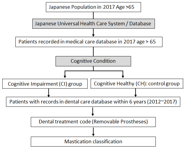 This study was approved by Japan’s Ministry of Health, Labor and Welfare in 2018, and the dataset is obtained from the Japanese (UHCS) in 2020 and was approved by the Institutional Review Board of Iwate Medical University Japan (IMU_01301). Figure 2 indicated the scheme for data collection. Patients over 65 years old who visited a medical office in 2017 were the first group included in the study. Patients in that group diagnosed with and without cognitive impairment (Alzheimer’s disease or dementia) were identified. Diagnoses include pre-senile dementia of the Alzheimer’s type, Alzheimer’s type dementia, Alzheimer’s type not specified dementia, senile dementia of the Alzheimer’s type, frontotemporal dementia, senile cognition, dementia, cortical dementia, and subcortical dementia. Then among those patients, those who visited the dental office during 2012~2017 and received removable prosthesis were extracted and used for data analysis.