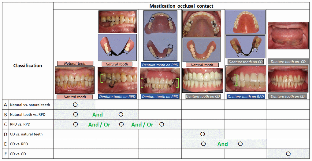 The masticatory schemes were determined using dental insurance codes for removable prosthetic treatments; complete dentures (CD): 313017010, and removable partial dentures (RPD). Subjects were then categorized into six groups of masticatory classifications depending on their masticatory patterns: subjects with (A) no removable prostheses (dentures) and only tooth-borne occlusion by natural-natural tooth contact; (B) an RPD in one arch with occlusion of natural-denture tooth contacts in addition to natural-natural tooth contacts; (C) RPDs in both arches with occlusion in combination of denture-denture and/or natural-denture and/or natural-natural tooth contacts; (D) a CD in one arch with occlusion of only natural-denture tooth contacts; (E) CD and RPD in opposing arches with occlusion of denture-denture and denture-natural tooth contacts; and (F) CDs in both arches with only denture-denture tooth contacts in the absence of natural teeth (Figure 3). RPDs vary in shape depending on the number of missing teeth and sample images of RPD are represented in Figure 3.