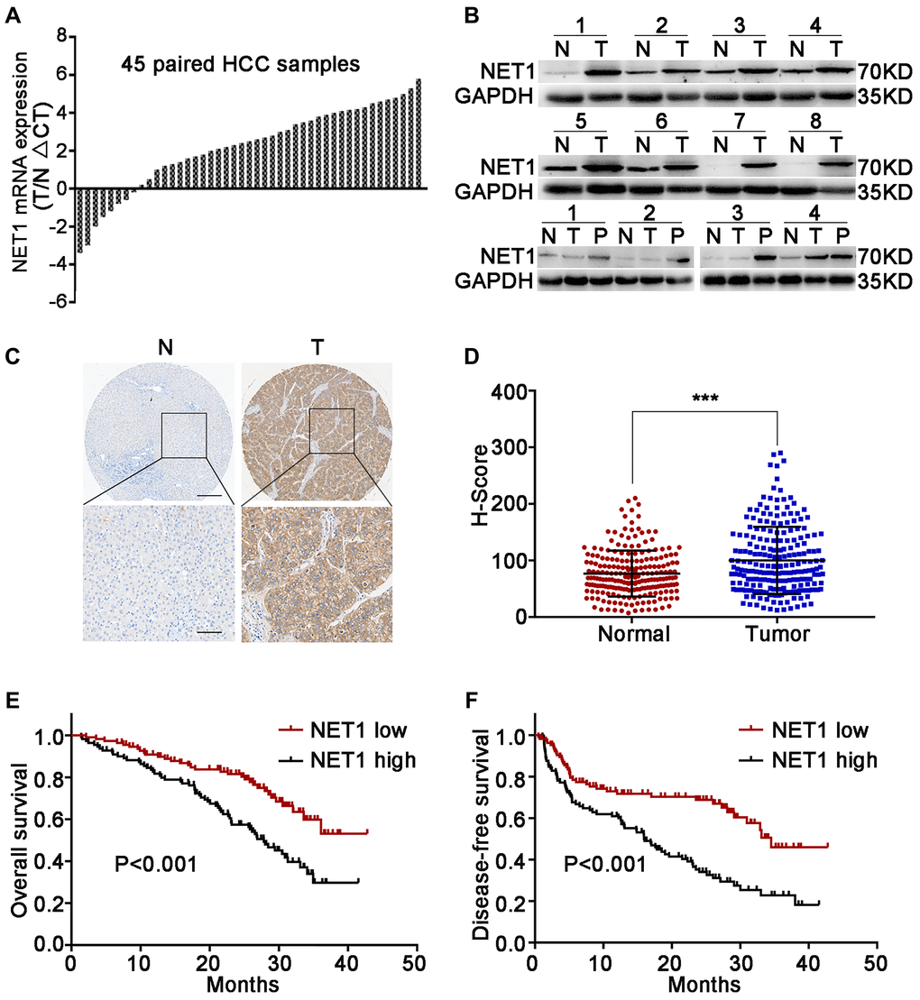Firstly, the mRNA levels of NET1 in 45 pairs of clinical HCC and paired normal tissues were evaluated. NET1 was upregulated in 37 pairs of tissues, which accounted for 82% of total samples (Figure 1A). Next, the protein levels of NET1 were detected in 12 pairs of randomly selected HCC tissues and the corresponding matched normal tissues. Elevated protein expression of NET1 was noted in all tested paired tissues (Figure 1B). The relationship between NET1 expression and some clinical features was examined based on a TMA constructed from 210 HCC specimens by IHC staining. Immunohistochemistry analysis revealed that the H-score of NET1 staining in tumor tissue was remarkably higher that of the adjacent normal tissue (P < 0.001; Figure 1C, 1D). In addition, HCC patients with high NET1 expression (with H-score ≥ 81) were found to exhibit poor DFS and OS (both P < 0.001) compared to those with low NET1 expression (H-score <81; Figure 1E, 1F). Collectively, these results revealed that NET1 is overexpressed in HCC tissue, and that increased NET1 expression may confer poor clinical prognosis in HCC patients.